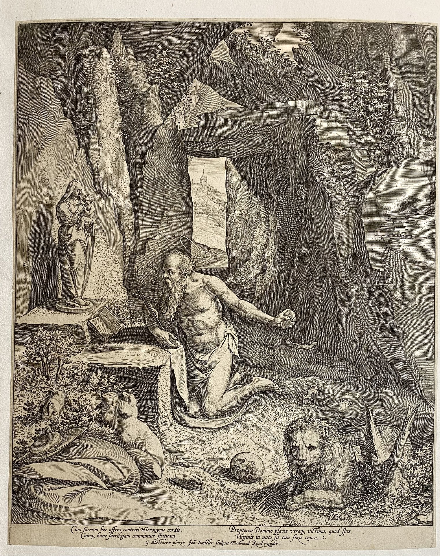 All'interno di una grotta, lontana rispetto al profilo del castello che si vede sullo sfondo, viene rappresentato San Girolamo inginocchiato. Conforme alla iconografia il Santo è un uomo anziano, barbuto, il volto segnato dalle rughe stride con il corpo plastico e vigoroso coperto solo da un leggero perizoma. Con la mano destra sorregge un crocifisso, nella sinistra una pietra nell'atto di flagellarsi. Il suo sguardo si posa dinanzi ad un libro di preghiere aperto e oltre la statua della Vergine con il Bambino. In primo piano il leone attributo del Santo, un teschio simbolo della caducità della vita terrena e sulla sinistra una statua di una donna nuda in pezzi, gettata fra i rovi. Sotto l'immagine incise quattro righe in latino su due colonne: Cum sacrum... / ...tua fixa cruce . Più sotto al centro: G. Monstaert pinxit. Joh. Sadeler Sculpit. Ferdinand Reael excudit. Gillis Mostaert the Elder (Hulst 1528–Anversa 1598) è stato un pittore e disegnatore rinascimentale con una fiorente bottega ad Anversa, è oggi ricordato per i soggetti di paesaggio, in particolare notturni o con effetti di incendi. Nella scheda dell'esemplare conservato presso il British Museum si legge che esiste un foglio speculare nel quale Sadeler ha inciso una Maddalena.