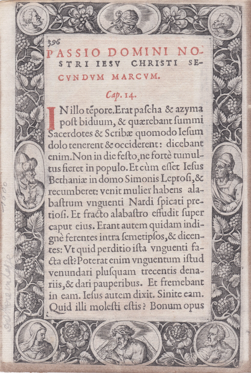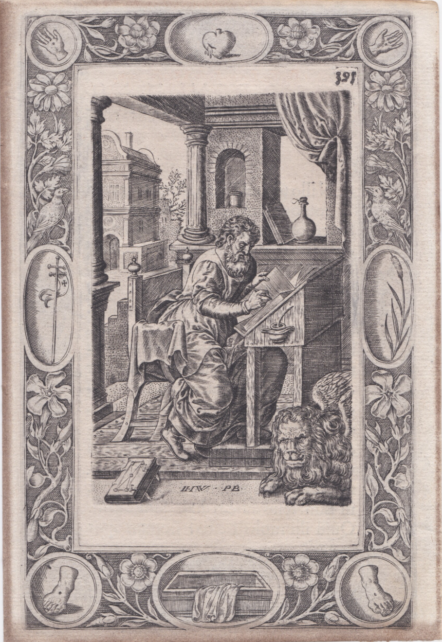 Da un'invenzione di Pieter van der Borcht (ca. 1530–1608). Il soggetto è stampato all'interno di una cornice incisa con motivi floreali e uccelli intercalati da ovali con simboli della passione. Il santo è intento alla scrittura all'interno dello studio tipicamente rinascimentale. In primo piano il leone alato e un libro chiuso attributi dell’evangelista. Il paesaggio cittadino alle sue spalle è tipicamente nordico. Firma in lastra  con i monogrammi dell'autore e dell'inventore: PB IH.W, in alto a destra il numero 395 corrispondente alla pagina. Al verso è stampato in nero e rosso l'incipit del capitolo 14  del Vangelo di Marco relativo alla Passione di Nostro Signore Gesù Cristo. Il testo è inserito entro cornice incisa floreale intercalata da ovali con ritratti dei protagonisti della Passione.  .
