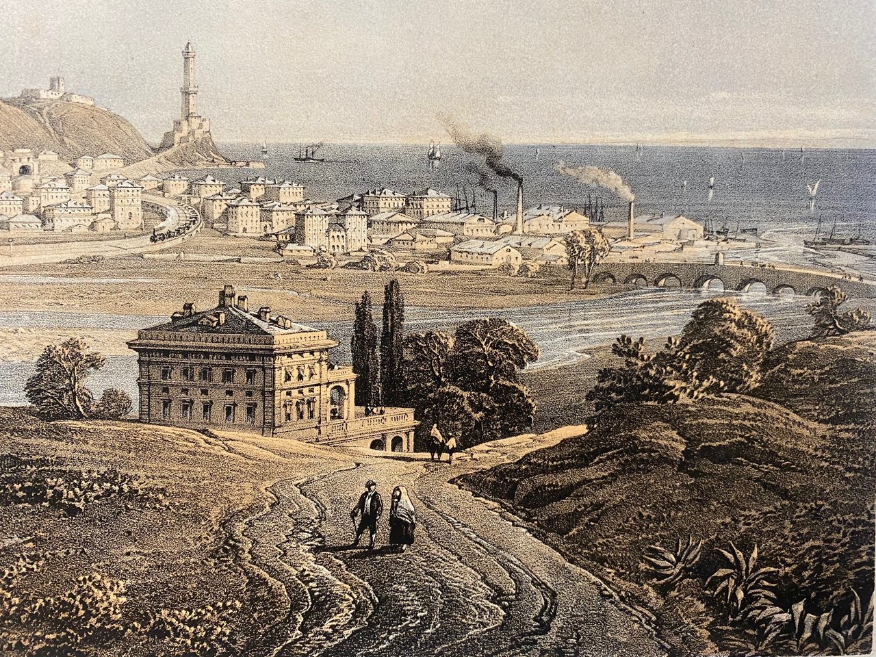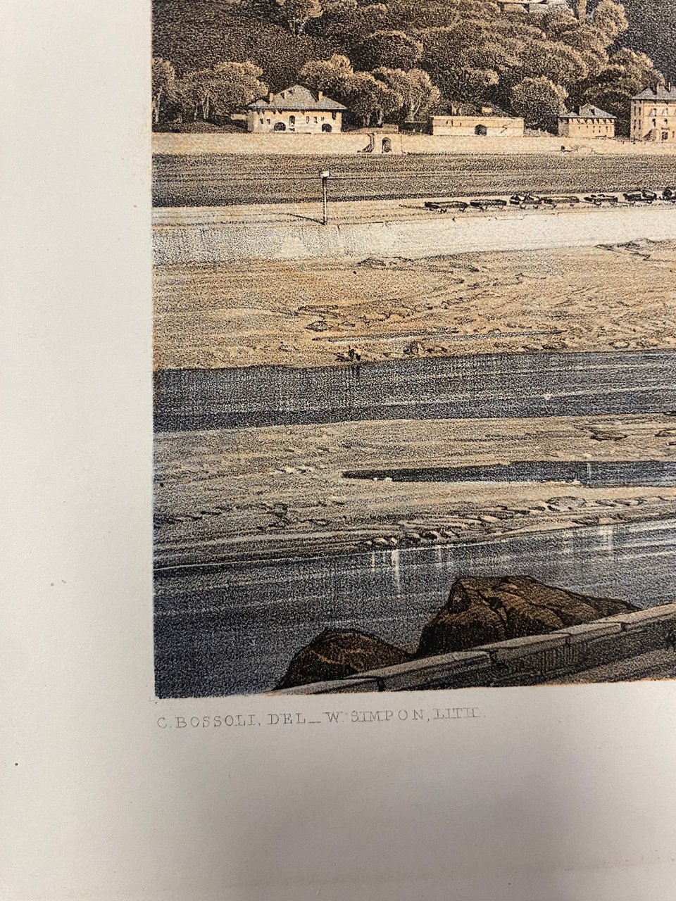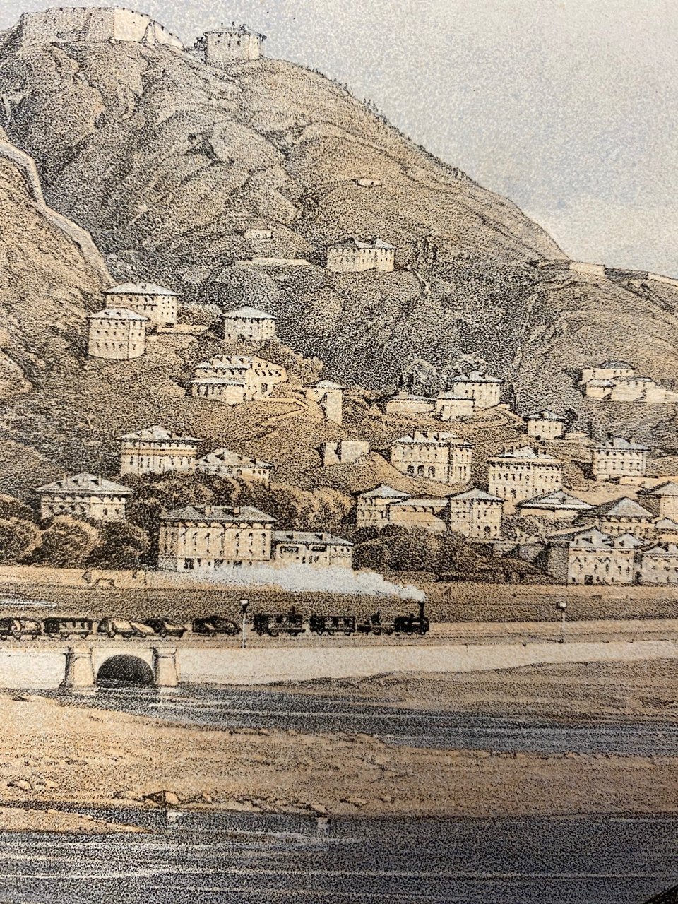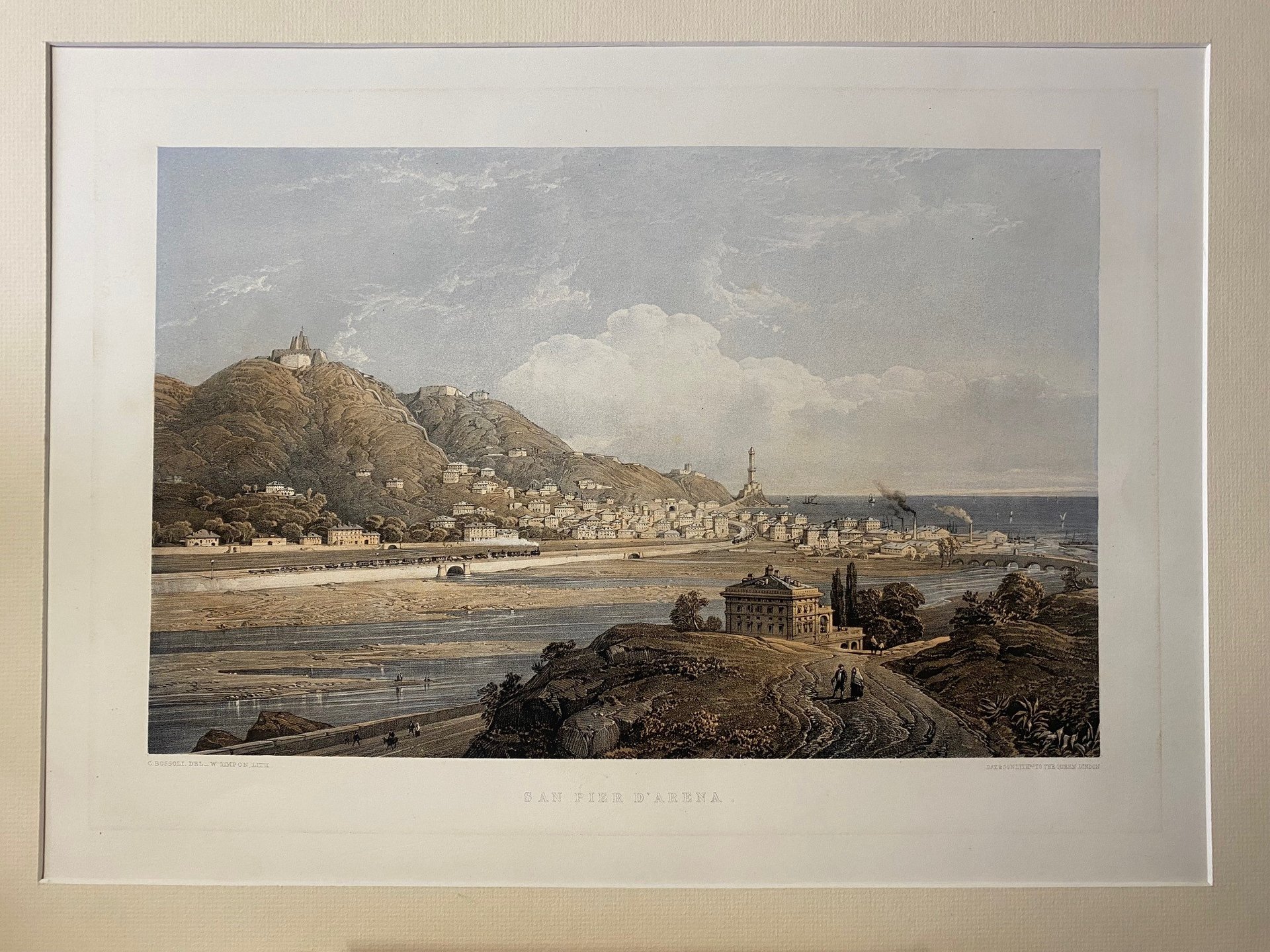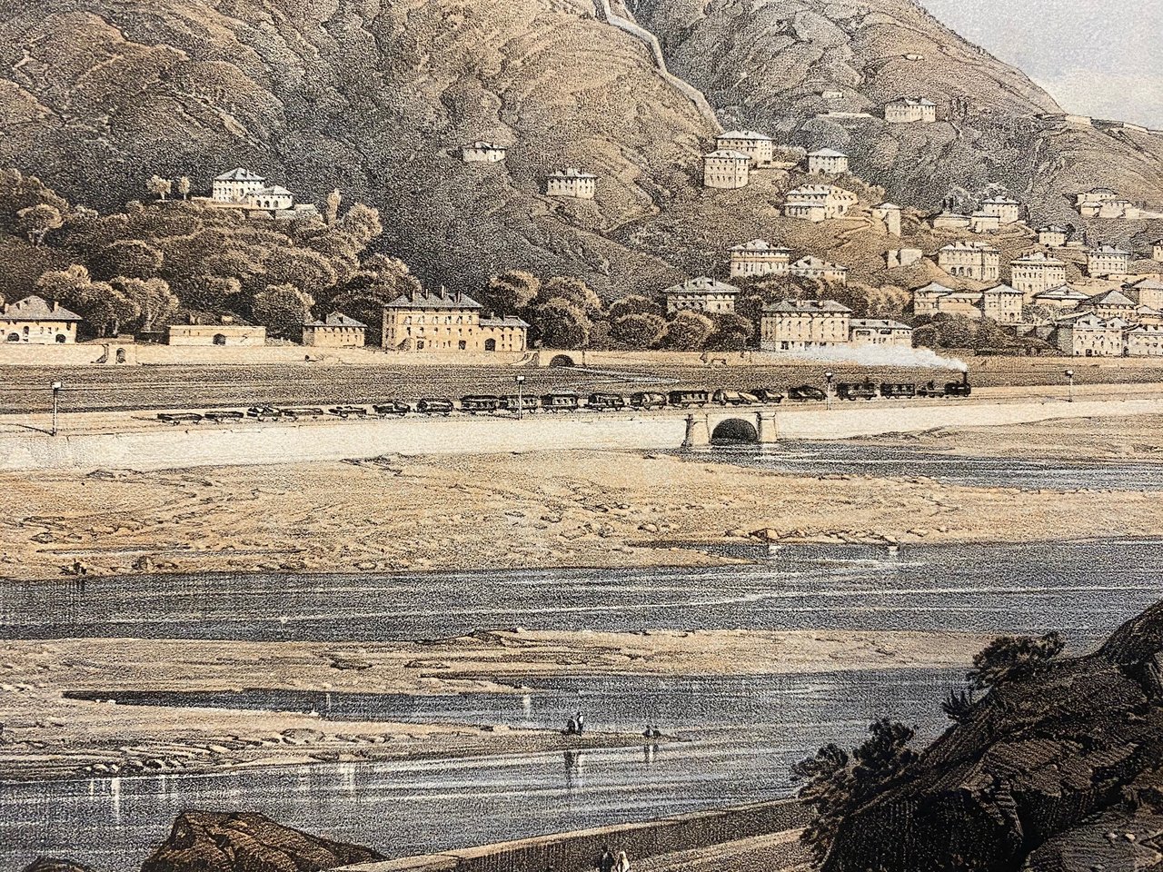 stampa antica originale realizzata con tecnica litografica a colori - dimensione foglio cm 66x44.5- soggetto disegnato da Carlo Bossoli (1815-1884) per illustrare il tratto della ferrovia Genova -Torino , tradotte in stampa e pubblicate a Londra nel 1853. Esemplare in ottimo stato di conservazione- presente lievissima traccia di precedente passe-partout che ha lasciato un lieve riquadro intorno all'area litografata.