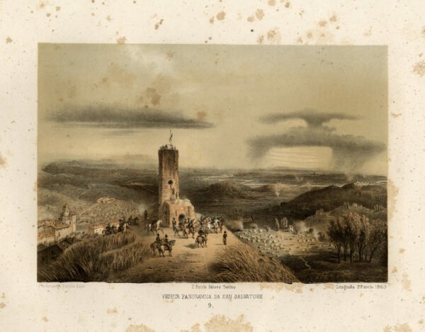 SAN SALVATORE - MONFERRATO - Guerra d'Italia. Veduta panoramica da San Salvatore. Litografia con veduta dall'alto dell'accampamento militare e dintorni.