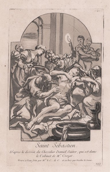 Chiaroscuro e acquaforte, circa 1740, firmato in lastra in basso al centro. Da un dipinto di Daniel Seiter. Magnifica prova, impressa su carta vergata coeva, con margini, in perfetto stato di conservazione. Il chiaroscuro è opera di Nicolas le Seur (Parigi 1690 - 1764). La tavola appartiene alla serie "Recueil d'estampes d'après les plus beaux tableaux et d'après les plus beaux desseins qui sont en France". Anche nota come "Recueil Crozat", la serie è ccomposta da due volumi di tavole commissionare dal collezionista francese Pierre Crozat e rirpoducenti famosi dipinti e disegni della sua epoca. Il primo volume, di 140 tavole, fu pubblicato nel 1729; il secondo - di 42 tavole (invece che le 110 iniziali) - fu pubblicato nel 1740. Dopo la morte di Crozat, i rami furono venduti ad alcuni librai che incaricarono Mariette di riorganizzare la raccolta. Mariette organizzò le tavole in due volumi, aggiungendo alcune descrizioni mancanti, e pubblicando l'opera nel 1742. Nel 1764 Basan ripubblicò la raccolta ma incidendo le tavole con la tecnica xilografica. Etching and chiaroscuro, 1740 circa, signed at lower center. After Daniel Seiter. A fine impression, on contemporary laid paper, with margins, perfect condition. The charoscuro is by Nicolas Le Seur. The plate is from the series "Recueil d'estampes d'après les plus beaux tableaux et d'après les plus beaux desseins qui sont en France". Also known as 'Recueil Crozat', is a series of plates commissioned by the collector Pierre Crozat and reproducing famous paintings and drawings of the era; 140 plates were published in 1729. A second volume formed by 42 prints (instead of the 110 plates initially planned) was issued in 1740. After Crozat's death, the plates were sold to a company of booksellers who commissioned Mariette to reorganize the 'Recueil'; Mariette divided the plates into two volumes, added some missing descriptions, and advertised the set to the public in 1742. In 1764, Basan bought the plates and the text, and republished the 'Recueil', but replaced the woodcuts by intaglio prints. Basan also published the 45 plates reproducing the Italian paintings from the collection of the Duc d'Orléans in a volume entitled 'Recueil d'après la gallerie du palais royal'. Cfr.