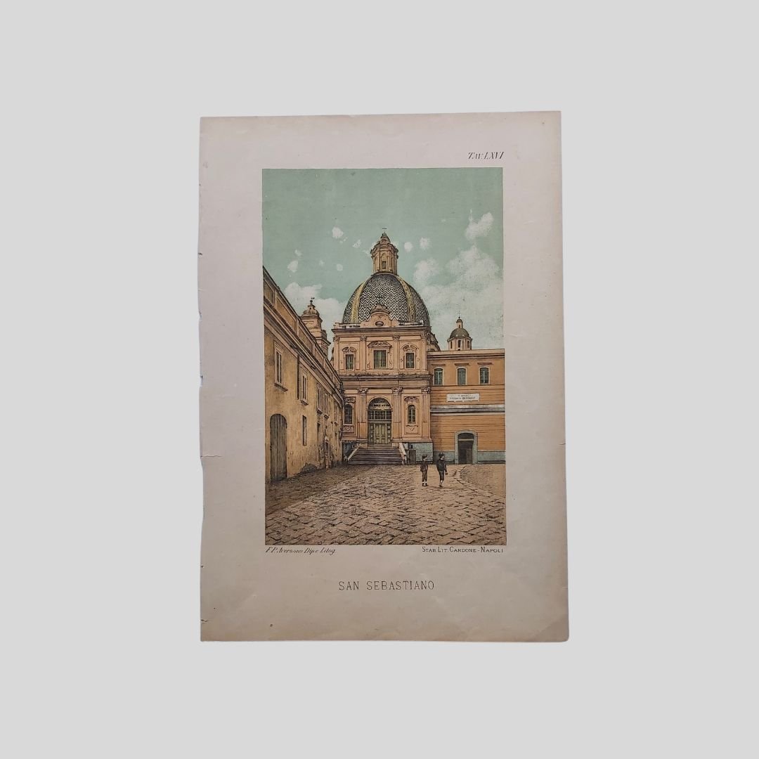 Cromolitografia di F.P. Aversano. Napoli, Stab. Lit. Cardone, 1889, mm 310×197 (alla battuta), mm 430×298 (tavola). Tracce d’uso marginali. Rara. Rara tavola della Chiesa di San Sebastiano, sull’ omonima via napoletana. La chiesa è andata distrutta nel 1941 per collasso strutturale, mentre il convento ospita attualmente il liceo classico Vittorio Emanuele. Tratta da: Raffaele D’Ambra, Napoli antica, Stab. Tipografico Cav. R. Cardone, Napoli 1889
