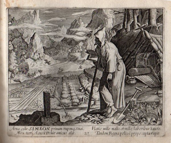 San SIMEONE EREMITA – THOMAS de LEU [Leeuw or Le Leup or Deleu] (1560–1612) – “Arua colit SIMEON primum rupemq Sinai…” Magnifica impressione. Il santo con vanga e bastone, davanti ad un rigoglioso campo di cavoli, con uccelli, animali salvatici e una capanna. Stupendo anche il paesaggio montano sullo sfondo.