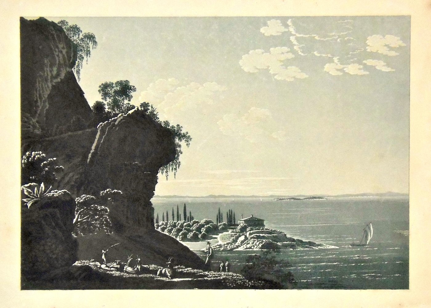 Acquatinta incisa in rame da Rordorf su disegno di Wetzel, stampata a due colori, mm 192x275.<BR>Suggestiva veduta presa da nord con il celebre complesso di villa Guarienti in secondo piano, tratta dalla celebre opera " Voyage pittoresque au Lac de Garde ou Benaco " pubblicata da Orel Fussli, senz'altro la più ricercata ed elegante serie pubblicata sul lago di Garda.<BR>Esemplare di prova di stampa, senza titolo e note editoriali, perfettamente conservato, con ampi margini.<BR>Sinistri-Spini " Il Garda nelle stampe ", 59. <BR>