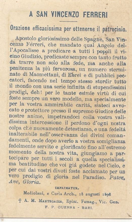 Santino Antico SAN VINCENZO FERRERI Imprimatura Mediolani e Curia Arch. 18 augusti 1898. A. M. Mantegazza, Episc. Famag. Vic. Gen. stampato da F. P. Guerra, Bari. dimensioni: 7 x 11 cm Stato di conservazione: ottimo (COME DA FOTO)