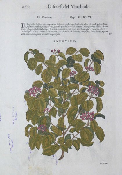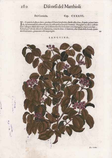 Opera tratta da I discorsi di M. Pietro Andrea Matthioli sanese, medico cesareo, et del serenissimo prencipe Ferdinando arcidvca d'Austria & c. Ne i sei Libri di Pedacio Dioscoride Anazarbeo della materia medicinale. ' Con dedica alla Principessa Giovanna, arciduchessa d’Austria (il Mattioli era medico reale), escono in volgare, nel 1568, i sei libri di nuovo dallo istesso autore ricorretti, & in più di mille luoghi aumentati. Con le figure grandi tutte di nuovo rifatte, & tirate dalle naturali & vive piante & animali, & in numero maggiore che le altre per avanti stampate. ' Lo stesso Pietro Andrea Mattioli presenta così la nuova edizione del libro, che già ha ricevuto molti consensi e che toccherà il culmine del successo grazie, appunto, alla forma di presentazione molto più organica, alla completezza delle informazioni, e, soprattutto, alla ricchezza e alla chiarezza delle illustrazioni. Chi sapesse tutte le virtù delle piante farebbe miracoli: questo enunciato dell’autore sembra animare per primo proprio lui, che va a cercare con certosina pazienza ogni minimo appiglio per lodare le virtù medicinali di ogni erba, raccontando ogni aneddoto, scoprendo ogni notizia curiosa, riportando ogni considerazione fatta sull’argomento da altri studiosi prima di lui. ' Il tono enciclopedico dell’opera si avverte, in maniera evidente, fin dalla dedica. Il discorrere dell’autore, le cui radici toscane o, per meglio dire, senesi non si smentiscono, è agile, piano, adatto ad un pubblico ampio, anche meno colto e poco preparato ma che, in qualche maniera, faceva parte del vasto mondo della medicina e della farmacia del tempo. Non è un caso che il testo sia tra quelli rimasti più a lungo in uso, anche nel piccolo bagaglio librario di famiglie povere o quasi analfabete. ' Alla sostanziosa dedica segue un proemio dedicato agli addetti ai lavori e le solite lettere di complimenti. Seguono due copiose tavole, cioè due indici: uno analitico per tutte le voci, l’altro per patologie. ' L’opera vera e propria inizia con il ritratto a piena pagina di Mattioli e illustra, in sequenza, le piante medicinali (concentrate nei primi quattro libri) e una serie di preparazioni (oli, unguenti, ecc.). Per Mattioli l’occasione è ghiotta sia per potersi dilungare sulla esatta identificazione delle specie, mostrando una vasta preparazione botanica, sia, soprattutto, per mostrare le splendide immagini delle piante, che, a volte, sono anche più di una per esemplare e messe a confronto, qualora il lettore avesse dubbi. Il secondo libro è dedicato in parte agli animali marini (ricci, spugne, seppie, pesci, ecc.) in parte a quelli terrestri (lepri, capriolo, castoreo, rospo, ecc.), comprese le vipere e le api con relativi prodotti (miele, cera, propoli, ecc.). Il quinto libro è dedicato ai minerali e il sesto ai veleni. ' Di ogni voce viene riportato il testo di Dioscoride tradotto in italiano, un esame moderno di identificazione con analogie e confronto dei pareri di autori diversi poi le virtù e i nomi in più lingue. ' Un’opera che ha lasciato il segno nella letteratura medica e farmaceutica del Rinascimento e che, ancora oggi, sprizza fascino ad ogni pagina. Plate taken from I discorsi di M. Pietro Andrea Matthioli sanese, medico cesareo, et del serenissimo prencipe Ferdinando arcidvca d'Austria & c. Ne i sei Libri di Pedacio Dioscoride Anazarbeo della materia medicinale printed in Venice by Vincenzo Valgrisi. Mattioli's Italian translation of the works of Dioscorides. ' Mattioli (1501-1577) was a Siennese doctor and naturalist. He described more than one hundred new plants and contributed to the development of medical botany. This, his most important work, was first printed in 1544 in Italian, 1554 in Latin, French in 1561, Czech in 1562, and in German in 1563. ' The wood cuts in his work were accurate and standardized enough to allow for easy identification. While nominally a commentary on the work of the botanist Dioscordies, Mattioli significantly expanded the work by adding major new contributions. He relied in part on the contributions of the Turkish diplomat, Buscecq, his doctor, Quakelbeen, and the famed botanist, Luca Ghini, who founded the botanical garden in Pisa. ' In this work, Mattioli significantly provided the first known observation of a tomato being grown and eaten in Italy. Woodcut with fine later hand colour, good condition. Cfr.