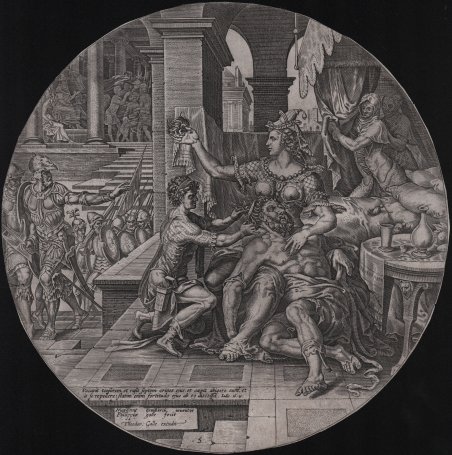 Bulino, 1560 circa, sullo scudo "Martin / heems / kerck / ' inven" e "Philippus gallus fecit H. Theodr Galle excudit". Numerato sotto "5". Esemplare di secondo stato con l'indirizzo dell'editore Hieronumus Cock sostituito da quello di Theodr Galle. Da un soggetto inventato da Maerten van Heemskerck, inciso da Philips Galle. Dalla serie "La storia di Sansone”, composta da sei tavole circolari (cfr. New Hollstein, 85-90). L’episodio raffigurato è narrato nell’Antico Testamento: Sansone è sdraiato in grembo a Dalila che gli porge una ciocca di capelli; un'altra figura è inginocchiata accanto a lui con delle forbici; un gruppo di soldati è in piedi a sinistra. Maarten Van Heemskerck (1498 - 1574), pittore e disegnatore, si formò ad Haarlem sotto Jan van Scorel e lavorò ad Haarlem e in Italia. Fu un prolifico disegnatore di composizioni per stampe, quasi tutte fatte da altri. Gli artisti che incisero dai suoi disegni sono Dirk Coornhert (1547-59 circa), Philips Galle (dal 1559), Cornelis Bos e Theodoor de Bry. Bellissima prova, ricca di toni, impressa su carta vergata coeva, rifilata al rame, in ottimo stato di conservazione. Bibliografia Riggs 1977 121; New Hollstein (Dutch & Flemish) 15 (Philips Galle); New Hollstein (Dutch & Flemish) 89.II (Maarten van Heemskerck). ' Samson and Delilah; Samson lies in the lap of Delilah and she holds up a lock of his hair; another figure kneels besides with scissors; a group of soldiers stand by at left; round plate; after Heemskerck. Lettered below left "Martinus hemskerck inventor / Philippus galle fecit / Theodor Galle excudit". Numbered below "5". ' Second state with the publisher’s address of Theodor Galle instead of ' Hieronymus Cock. Invented by Maerten van Heemskerck and engraved by Philips Galle. From the series ' The story of Samson, consisting of six circular plates (cfr. New Hollstein, nn. 85-90). ' Samson smiting the Philistines with the jawbone of an ass; a ferocious battle with a heap of bodies below; in the distance a field of wheat is in flames and Samson walks off with some gates. ' ' ' Maarten Van Heemskerck (1498 - 1574), ' painter and print designer, trained in Haarlem under Jan van Scorel and worked in Haarlem and Italy. He was a prolific designer of compositions for prints, almost all made by others. Artists who engraved after his drawings are Dirk Coornhert (c.1547-59), Philips Galle (from 1559), Cornelis Bos and Theodoor de Bry. ' A fine impression, printed with tone on contemporary laid paper, trimmed to the platemark, very good condition. Bibliografia Riggs 1977 121; New Hollstein (Dutch & Flemish) 15 (Philips Galle); New Hollstein (Dutch & Flemish) 89.II (Maarten van Heemskerck). Cfr.