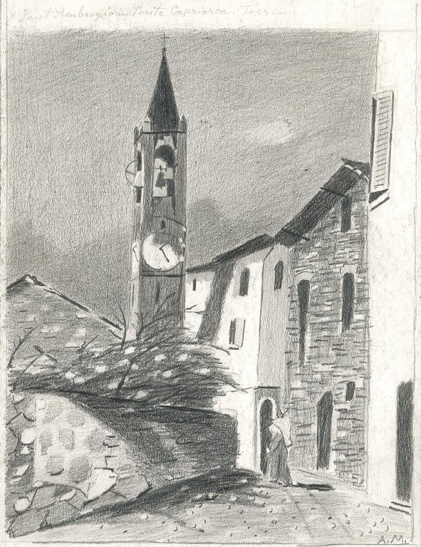 Disegno originale su carta pesante del primo '900, con veduta del paese e chiesa di Sant Ambrogio a Ponte Capriasca nella Svizzera ticinese. Titolo in alto a sinistra firmato con monogramma A. M. in basso a destra
