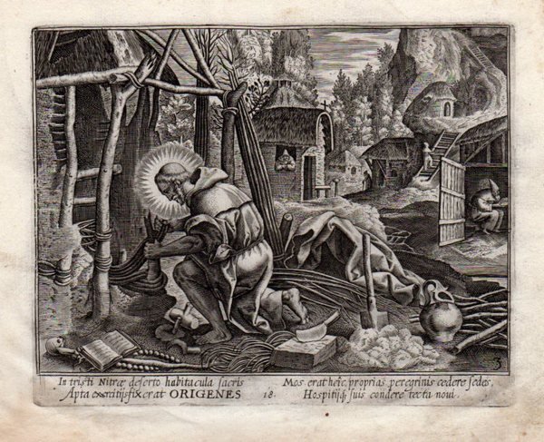 Sant'ORIGENE EREMITA - THOMAS de LEU [Leeuw or Le Leup or Deleu] (1560–1612) – ” … apta exercits fix erat ORIGENES.” Bellissima immagine del santo impegnato in lavori di edilizia. E’ stato un teologo e filosofo greco antico, noto anche come Origene di Alessandria. È considerato uno tra i principali scrittori e teologi cristiani dei primi tre secoli. Di famiglia greca, fu direttore della «scuola catechetica» di Alessandria (Didaskaleion). Interpretò la transizione dalla filosofia pagana al cristianesimo e fu l’ideatore del primo grande sistema di filosofia cristiana.