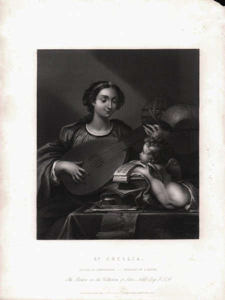 Santa Cecilia, da Domenichino; la santa raffigurata a mezzo busto a sinistra, mentre strimpella un liuto e legge da uno spartito tenuto aperto per lei da un cherubino sdraiato su un tavolo, a destra, con globi e un altro schizzo della santa che suona un violino appesi al bordo, appuntati sotto i libri. Acquaforte e bulino, 1843 circa, con titolo e titolo 'Painted by Domenichino - Engraved by L.Stocks. The Picture in the collection of John Noble Esq. F.S.A. / London Published for the Proprietors by Geo. Virtue, 26, Ivy Lane, 1844'. Buona impressione, stampata su carta vergata coeva, con margini, in ottime condizioni. Bibliografia Stocks 1993, A Catalogue of Line Engravings by Lumb Stocks R A collected by J P Stocks (undescribed). St Cecilia, after Domenichino; the saint shown half-length on the left, strumming a lute and reading from a score held open for her by a cherub lying on a table, on the right, with globes and another sketch of the saint playing a viol hanging over the edge, pinned below books; lettered state. Etching and engraving, 1843 circa, lettered with title and 'Painted by Domenichino - Engraved by L.Stocks. The Picture in the collection of John Noble Esq. F.S.A. / London Published for the Proprietors by Geo. Virtue, 26, Ivy Lane, 1844'. After Domenichino. A good impression, printed on contemporary wove paper, with margins, very good condition. Bibliografia Stocks 1993, A Catalogue of Line Engravings by Lumb Stocks R A collected by J P Stocks (undescribed). Cfr.