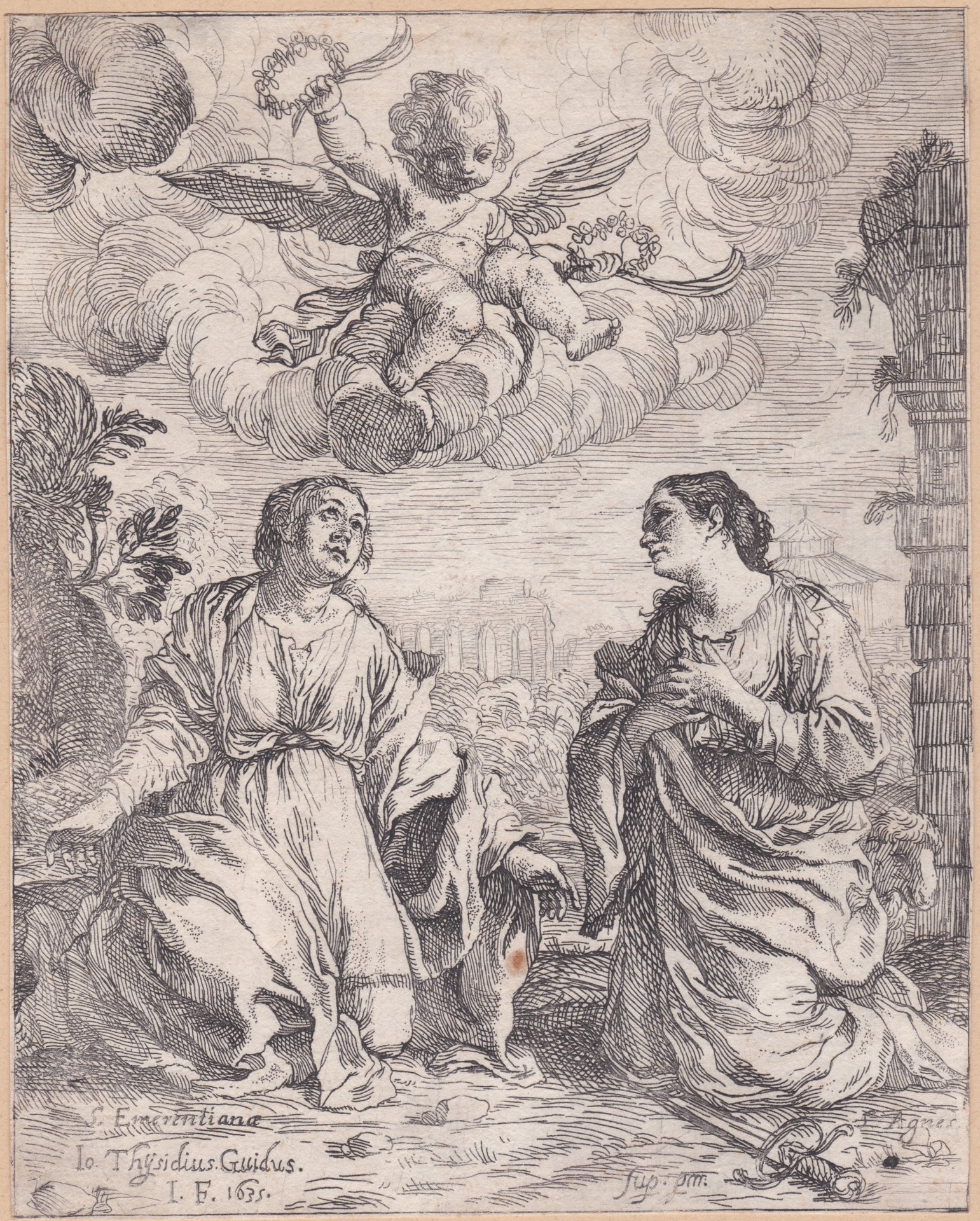 L'artista raffigura Santa Emerenziana, bisnonna di Gesù, e Sant'Agnese, sua sorella di latte, inginocchiate al centro mentre un putto discende dal cielo recando corone di fiori e due palme, simbolo del loro martirio. Sullo sfondo un paesaggio caratterizzato da rovine, forse Roma città dove entrambe vissero. Sotto le figure è inciso il loro nome. In basso a sinistra: Io Thisidius Guidus./I. F. 1635. A destra: sup. pm.” Stato unico.
