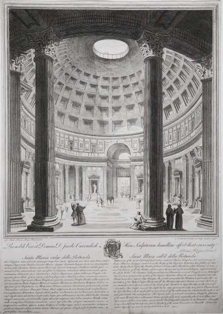 L'interno del Pantheon, o Santa Maria della Rotonda, disegnato e inciso da Louis Philippe Boitard sulla base di un dipinto di Giovanni Paolo Panini, è raffigurato con la luce del giorno che filtra dall'oculo del soffitto. La veduta è tra due colonne e guarda a nord dall'altare principale verso l'ingresso e la piazza della Rotonda. Alcune figure conversano, mentre altre ammirano l'architettura o guardano le due figure che si sporgono dal bordo dell'oculo. In basso, iscrizioni con la storia dell'edificio su due colonne, in latino a sinistra e inglese a destra. Acquaforte, 1738, firmata e datata in lastra Gio. Paolo Panini Roma Pinxit 1730. / L.P. Boitard Delin et Sculp. Londini 1738. Scritta sotto l'immagine in latino e inglese con il titolo, e la dedica dell'incisore, in latino, a James Cavendish, intorno a uno stemma. Giovanni Paolo Pannini (o Panini; Piacenza, 1691 – Roma, 1765) è stato un pittore, architetto e scenografo italiano. Da giovane Panini studiò a Piacenza come scenografo teatrale. Si recò a Roma nel 1711 dove studiò disegno con Benedetto Luti e divenne famoso come decoratore di palazzi, compresa villa Patrizi (1718-1725) e Palazzo de Carolis (1720). Come pittore, Panini è più conosciuto per le sue vedute di Roma; si interessò in particolare delle antichità della città, diventando uno dei grandi maestri del Grand Tour. Fra i suoi lavori più famosi c'è l'interno del Pantheon e le sue "vedute", dipinti di gallerie di quadri che a loro volta contengono viste di Roma. ' Nel 1718 Panini fu ammesso alla Congregazione dei Virtuosi al Pantheon. Insegnò a Roma all'Accademia di San Luca dal 1719 ed all'Académie de France dal 1732; tra i suoi allievi, Hubert Robert e Jean-Honoré Fragonard. Louis Philippe Boitard fu disegnatore e incisore. Figlio di François Boitard (1667-1719), nato in Francia, si stabilì a Londra tra il 1709 e il 1712 e con il quale probabilmente si formò; negli anni '40 del XVII secolo lavorò come apprendista nella bottega dell'incisore William Henry Toms, al fianco del giovane John Boydell. Acquaforte, impressa su carta vergata coeva, rifilata al rame, in ottimo stato di conservazione. Un bell'esemplare di quest'opera molto rara, ispirata dal quadro del Pannini, dal quale, tuttavia, differisce. ' The interior of the Pantheon, or Santa Maria della Rotunda, drawn and etched by Boitard after a painting by Giovanni Paolo Panini, is depicted with daylight streaming through the oculus in the ceiling. The view is between two columns, looking north from the main altar towards the entrance and the Piazza della Rotonda. A number of figures converse, while others admire the architecture or regard the two figures leaning over the edge of the oculus' opening. Inscription with the building's history in two columns, with Latin on the left and English on the right. Etching, 1738, lettered below the image in English and Italian with the title, a description, a dedication from the engraver, in Latin, to James Cavendish, around a crest and ' 'Gio. ' Paolo Panini Roma Pinxit 1730. / L.P. Boitard Delin et Sculp. ' Londini 1738. Giovanni Paolo Pannini (or Panini; Piacenza, 1691 - Rome, 1765) was an Italian painter, architect and stage designer. As a young man Panini studied in Piacenza as a theater set designer. He went to Rome in 1711 where he studied drawing with Benedetto Luti and became famous as a decorator of palaces, including Villa Patrizi (1718-1725) and Palazzo de Carolis (1720). As a painter, Panini is best known for his views of Rome; he was particularly interested in the city's antiquities and became one of the great masters of the Grand Tour. Among his most famous works is the interior of the Pantheon and his "vedute," paintings of picture galleries that in turn contain views of Rome. ' ' In 1718 Panini was admitted to the Congregation of the Virtuosi at the Pantheon. He taught in Rome at the Academy of St. Luke from 1719 and at the Académie de France from 1732; his students included Hubert Robert and Jean-Honoré Fragonard. Louis Philippe Boitard, sometimes incorrectly called Louis Pierre Boitard. Draughtsman and engraver; son of François Boitard (1667-1719), born in France; based in London 1709 to 1712 and with whom he probably trained; during 1740s he worked as a journeyman in the studio of the engraver, William Henry Toms, alongside the young John Boydell who recorded that he was addicted to snuff, always indigent and drowned in the New River. Etching, printed on contemporary laid paper, trimmed to the platemark, in good condition. A fine example of this very rare work. Cfr.