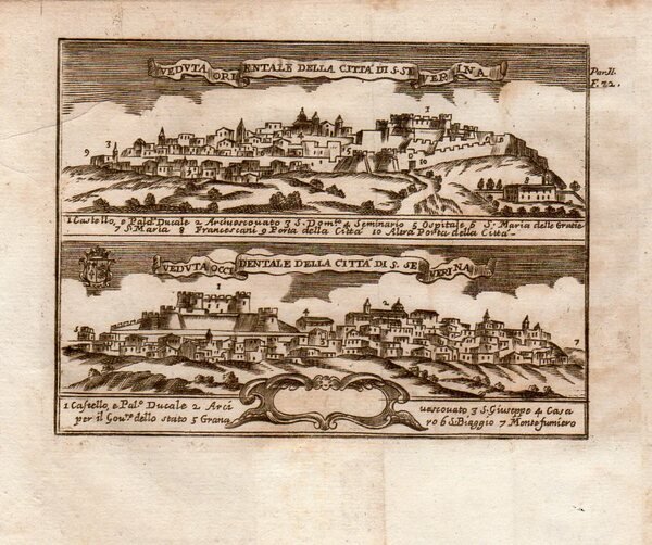 SANTA SEVERINA – “Veduta Orientale della Città di S. Severina” – “Veduta Occidentale della città di S. Severina” Due vedute su unica carta. Elenco dei luoghi notabili 1-10 / 1-7
