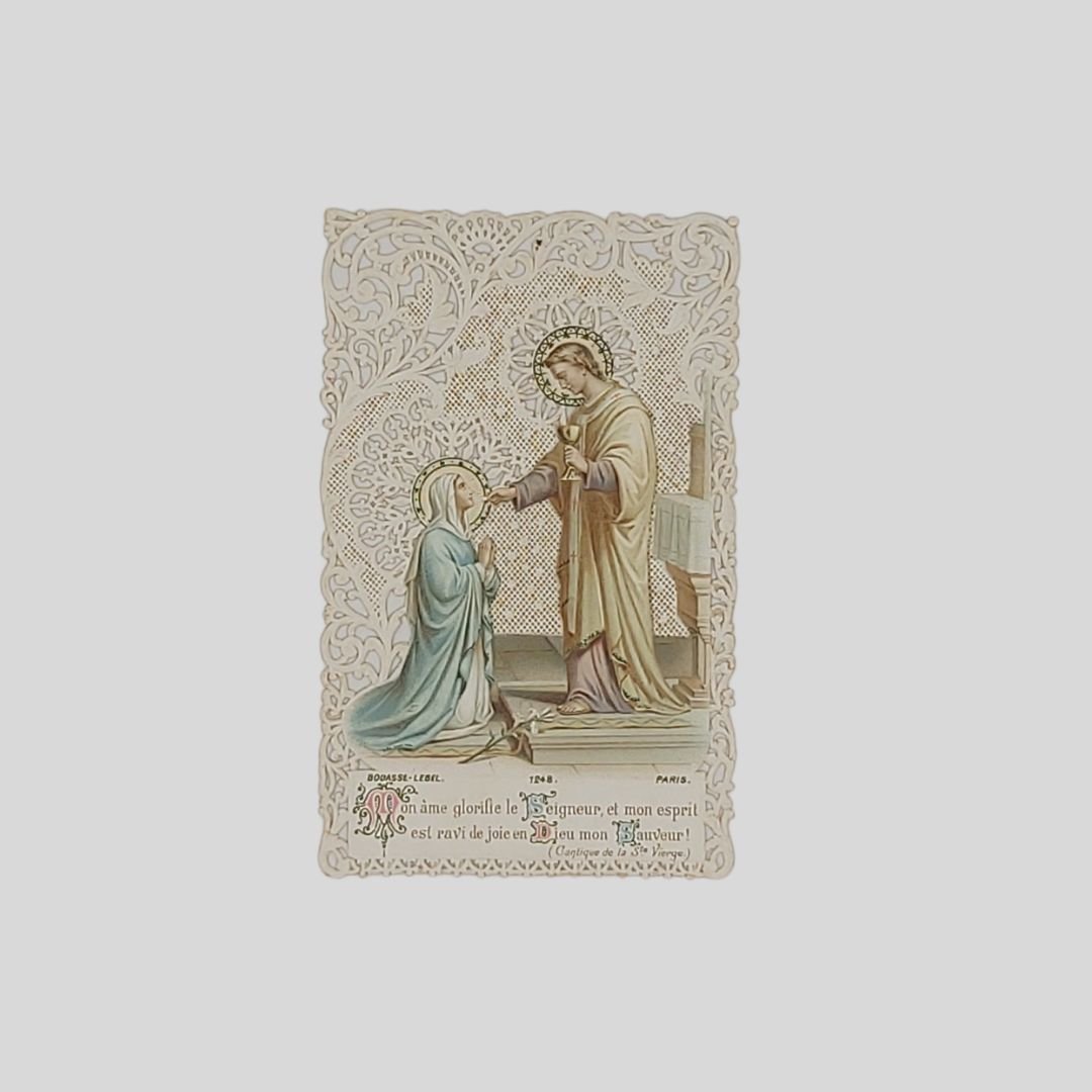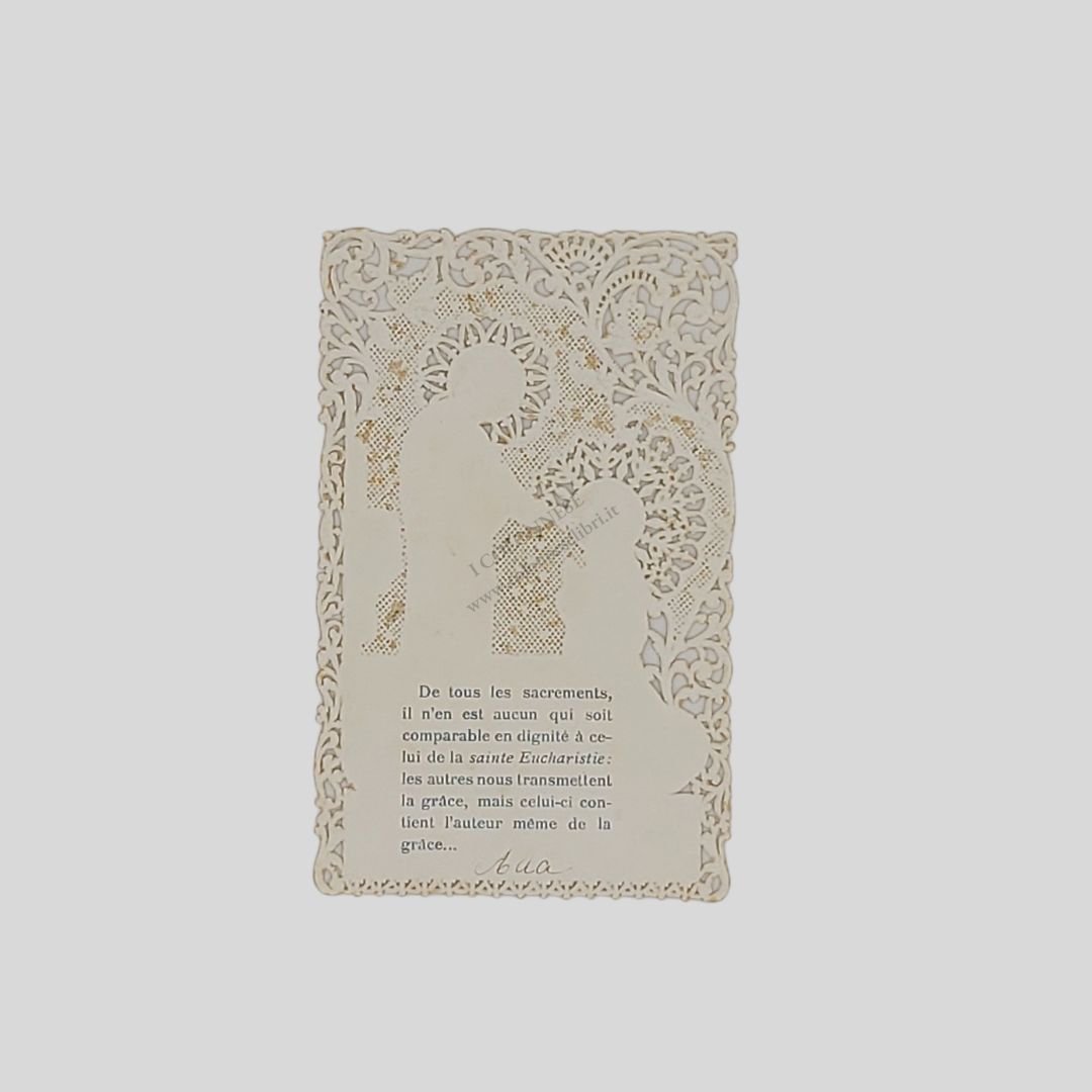 Immagine religiosa d’epoca, realizzato in carta e stoffa (cm 7×11,5). In buone condizioni. Al verso spiegazione del sacramento.