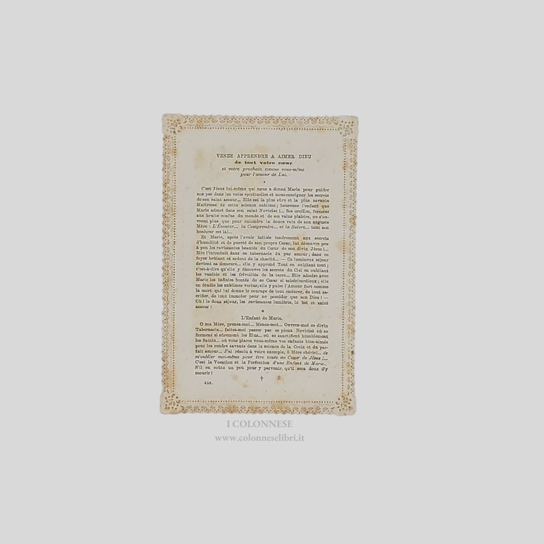 Immagine d’epoca, bordo in merletto (cm 8×12). Tracce d’uso.