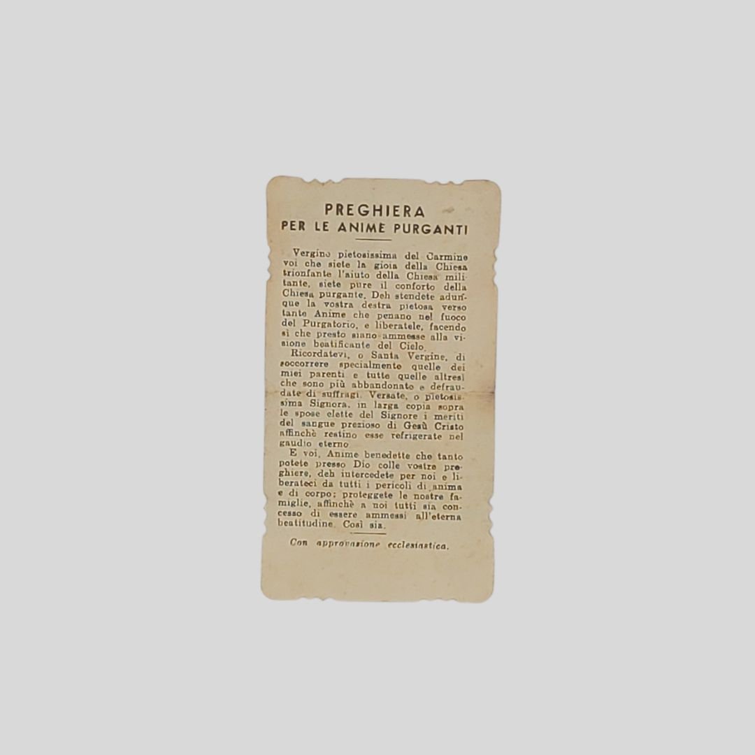 Immagine religiosa d’epoca di carta, s.d., cm 5,5×10. Piega di archiviazione. Al verso preghiera per le anime purganti.