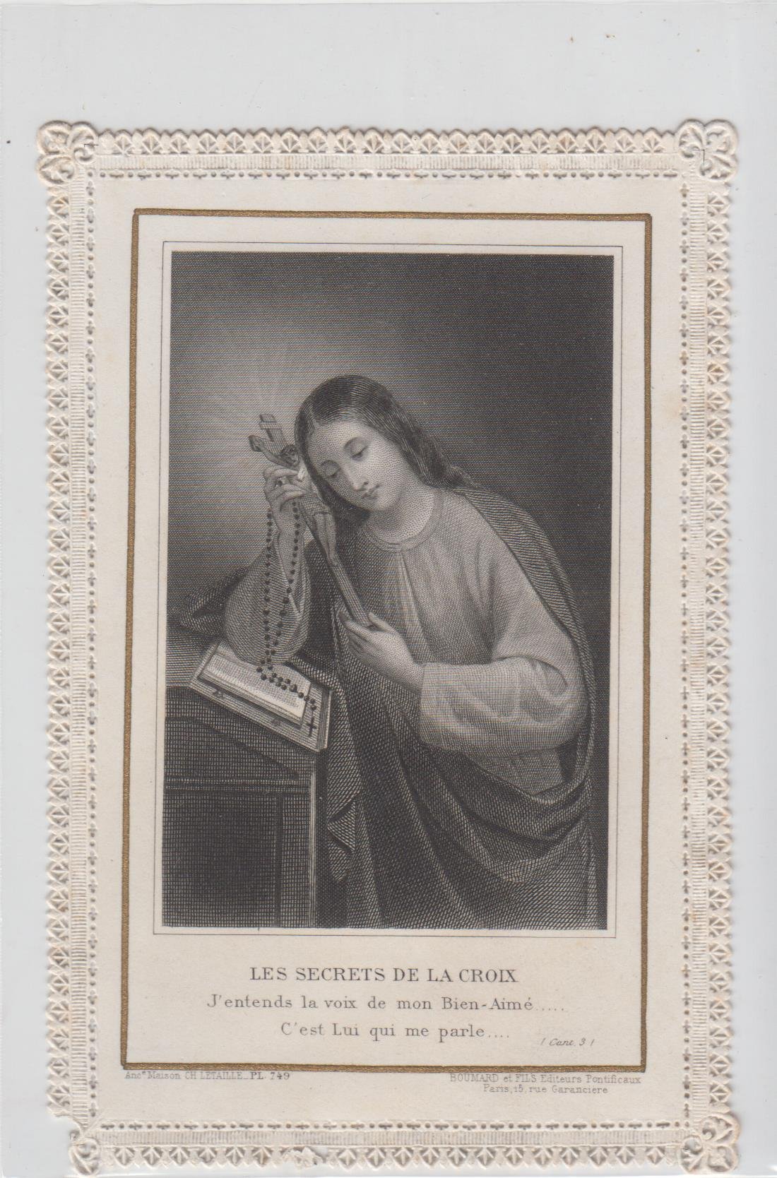 Santino del 19° sec. Emesso da Letaille, Boumard Fils Edit. Pontifical - Paris (FR) , dimensioni mm. 74 x 110 mm, Numero 320-16 , Forma Rettangolare, Orientamento Verticale, Bordi Trinati, Angoli Arrotondati, Colorazione Bianco e nero, Materiale Carta liscia, Tipo di stampa Siderografia, Tipologia Canivet Meccanico, Retro preghiera, Lingua Francese Alcune piccole fioriture e scritte a matita
