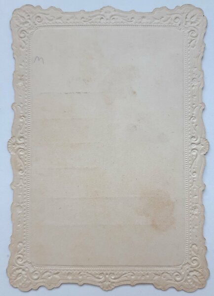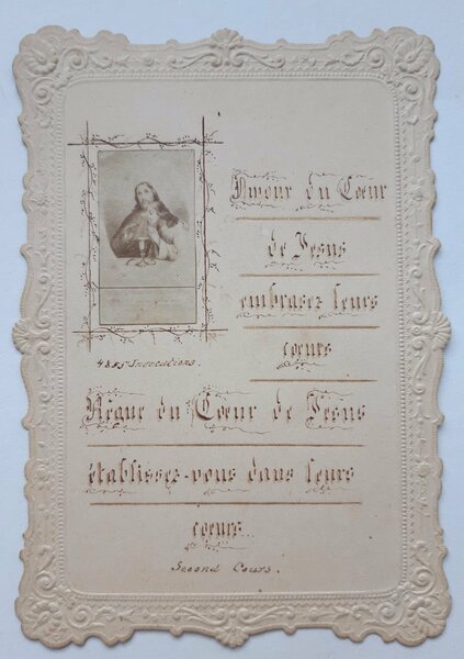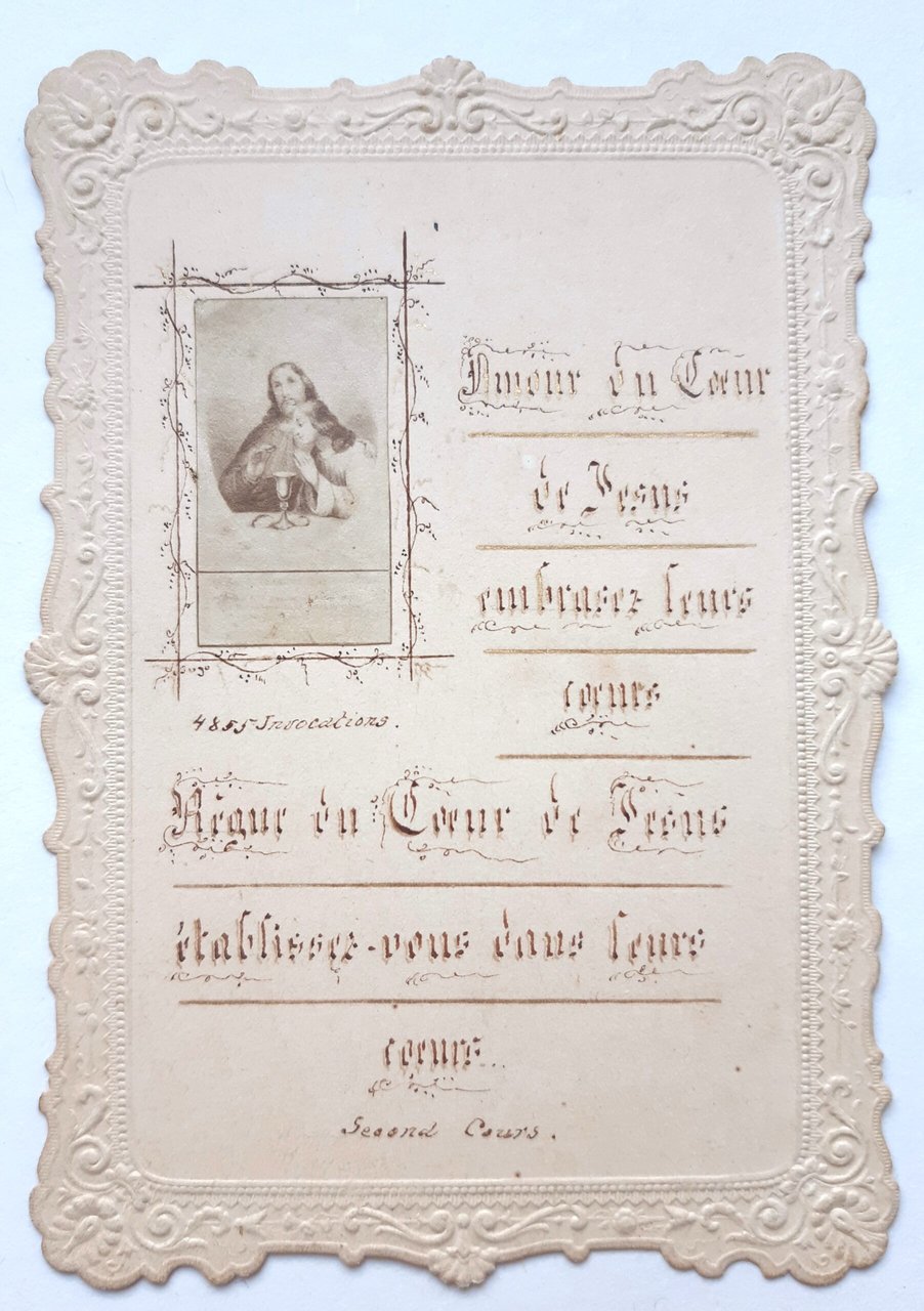 santino manufatto con immagine applicata e preghiera scritta a mano con margini irregolari a rilievo, in buono stato lievissima brunitura ai margini cm. 10,8 x 7,5