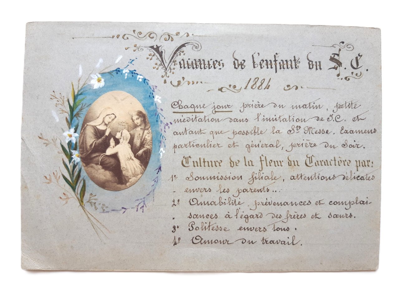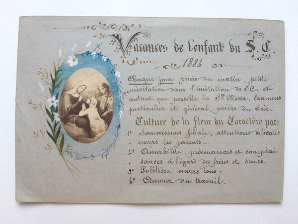 Santino manufatto con immagine applicata disegni e preghiera a mano, una piccola piega all'angolo inferiore sinistro cm. 7,5 x 11, una scritta a matita sul retro