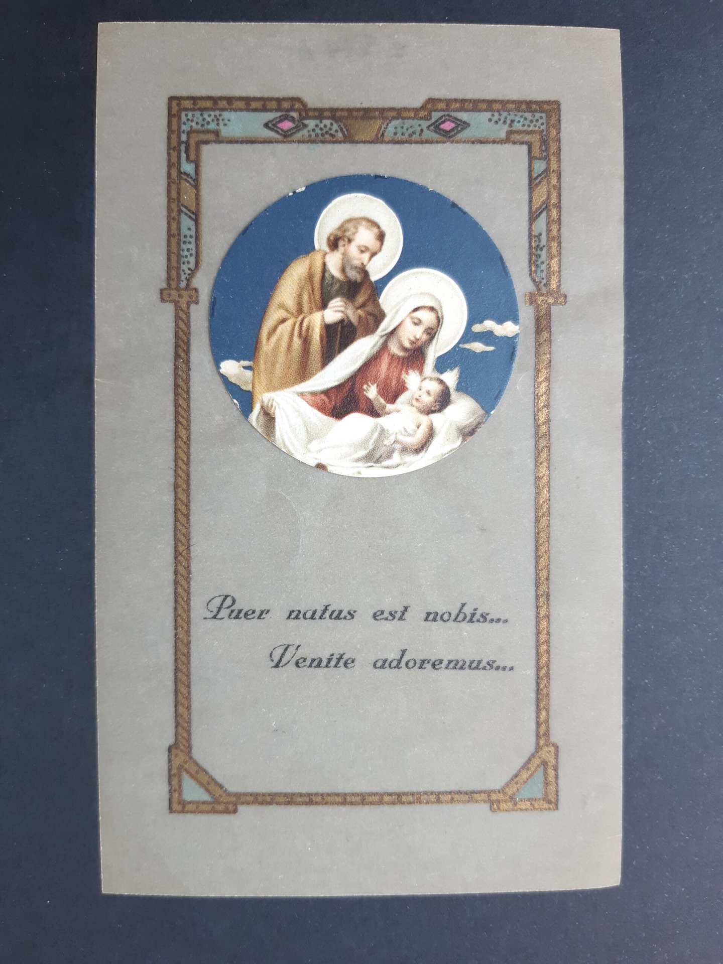 Santino in carta pergamena Natività Sacra famiglia con immagine applicata