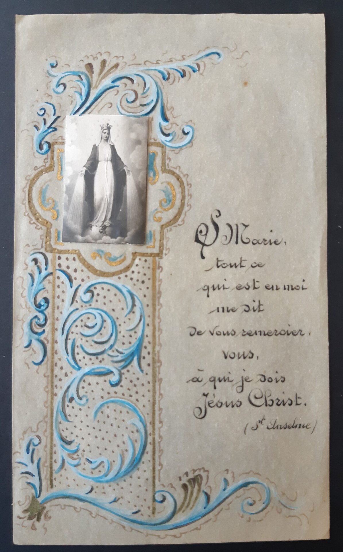 Santino manufatto carta pergamena Vergine Maria immagine applicata
