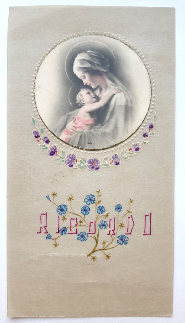Santino manufatto con immagine applicata e decorazioni a mano, su carta traslucida sottile in buono stato cm. 11,2 x 6
