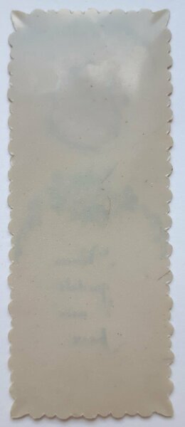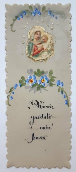santino manufatto in celluloide con immagine applicata e decorato a mano, in buono stato margini irregolari cm. 10,1 x 4,1
