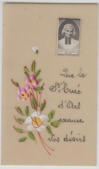 Santino manufatto in celluloide Saint. J. B. M. Vianney dipinto a mano 1920 c.a., tecnica collage dipinto a mano dimensioni cm. 8,4 x 5