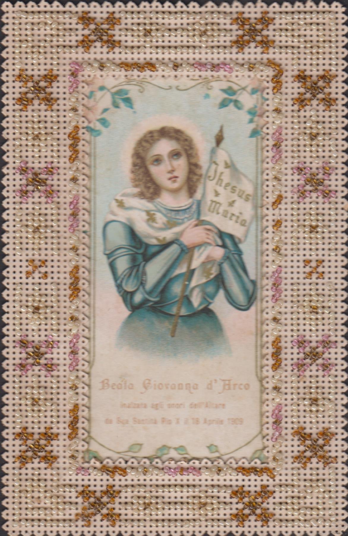 Santino manufatto merlettato ricamato con perline Beata Giovanna D'Arco 1909 holy card
