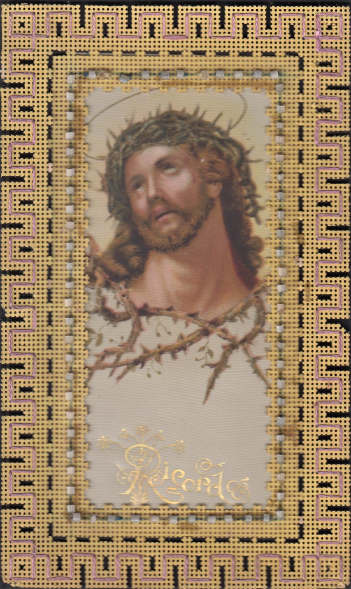 Santino manufatto merlettato ricamato con perline Gesù Cristo e corona di spine 1900 c.a.