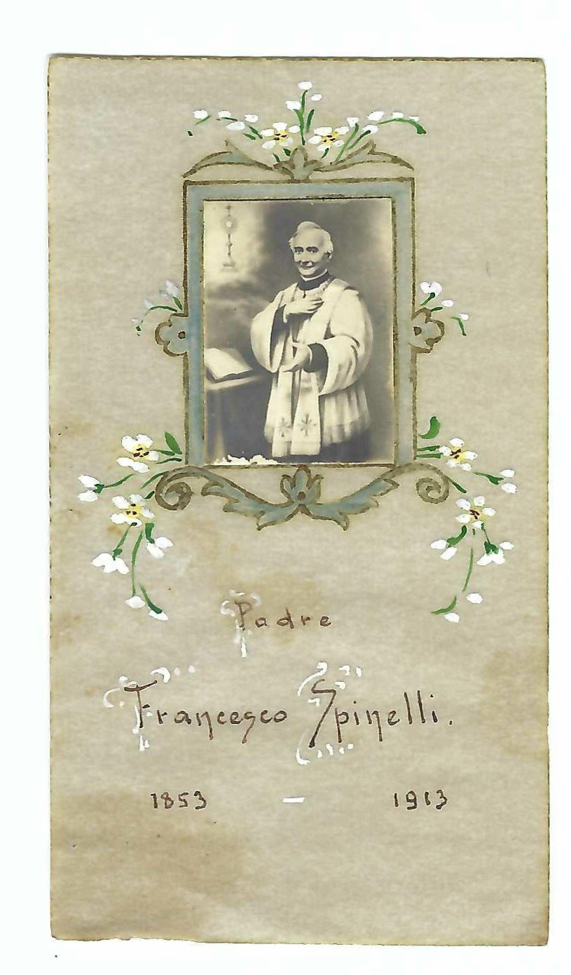 Santino S. Francesco Spinelli manufatto su pergamena dipinto a mano 1910 c.a. canivet holy card image pieuse