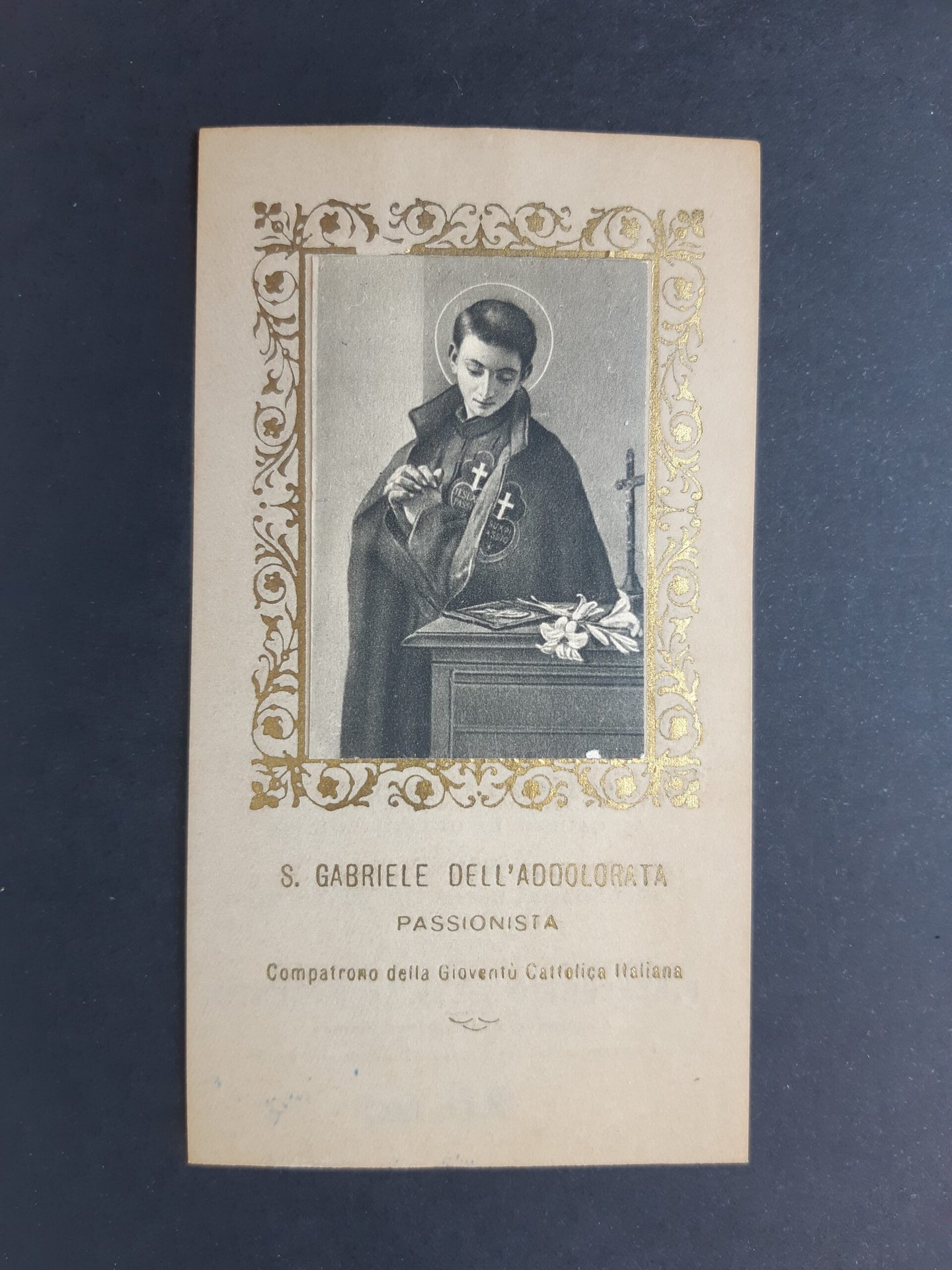 Santino S. Gabriele dell'Addolorata Passionista 1935 con immagine applicata cromolito