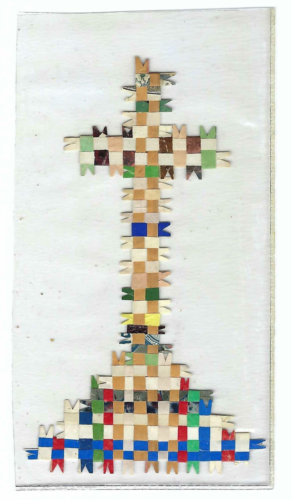 santino su carta intrecciata multicolor raffigurante la Croce di Gesù cm. 12,2 x 6,6, la croce intrecciata appare per la prima volta nel libro "Der Kindergarten" di Hermann Goldammer, pubblicato da Habel a Berlino nel 1869.