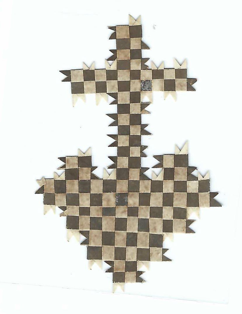 santino su carta intrecciata con alcune lievi sporcizie cm. 7,8 x 5,5, la croce intrecciata appare per la prima volta nel libro "Der Kindergarten" di Hermann Goldammer, pubblicato da Habel a Berlino nel 1869.