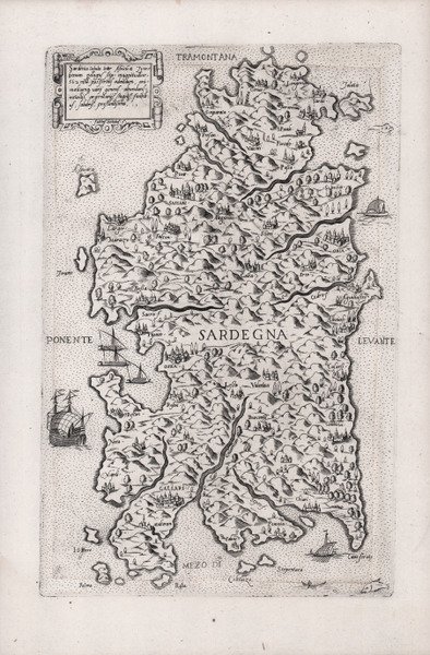Rara e ricercata carta della Sardegna incisa da Fabio Licinio e disegnata da Giacomo Gastaldi. Al centro dell’isola, con caratteri grandi, si trova il titolo: SARDEGNA. Nel cartiglio in alto a sinistra è incisa una breve descrizione geografica dell’isola: Sardinia insula inter Africu[m] et Tyrrhenum pelagus sita magnitudine 562 mill. pas: fertilis admodum animaliumque varij generis abundans metallis argentarijs stagnis fontibus salubris prestantissima. Nella cornice inferiore del cartiglio troviamo la firma dell’incisore Fabius Licinius. Orientazione nei quattro lati al centro, con il nome dei venti: TRAMONTANA, MEZO DI, LEVANTE, PONENTE, il nord è in alto. Carta priva di scala grafica e graduazione ai margini. “La carta della Sardegna firmata da Fabio Licinio è un prodotto di derivazione gastaldina. Viene attribuita dalle bibliografie allo stesso Gastaldi, in quanto il Licinio era solito lavorare per il cartografo piemontese. Nelle raccolte cinquecentesche la carta si trova spesso stampata in coppia con l’analoga mappa della Corsica firmata dal Licinio (catalogo n. 389). Secondo Almagià questa carta è verosimilmente il prototipo di questa tipologia di mappe sulla Sardegna. Sotto l’isola denominata Tolata (presumibilmente Tavolara) viene disegnata un’altra isola, priva di nesonimo. Non sono note ristampe” (cfr. S. Bifolco – F. Ronca, Cartografia e topografia italiana del XVI secolo (2018), p. 2106. Fabio Licinio (1521 – 1565), figlio del pittore Arrigo, proviene da una famiglia di artisti. In qualità di incisore, nel 1544 incide l’Annunciazione dalla pala del Pordenone in S. Maria degli Angeli di Murano, su disegno realizzato dal fratello Giulio, allora diciassettenne, come si ricava dall’iscrizione sulla stampa “Hanc Pordenon(is) J(iulius) Lycinius excud(it) Fabio Ve. fe(cit)”. Lavorò per la corte di Vienna; a lui infatti vengono versati 45 fiorini renani per aver mandato una “cartella” a Massimiliano II. Nella sua Libreria del segno di S. Marco, a Venezia, vendeva le sue opere, incisioni, stampe di riproduzione, ritratti e carte geografiche. Licinio fu uno dei più abili incisori di carte geografiche del XVI secolo. Lunga e prolifica fu la collaborazione artistica e commerciale con il cartografo Giacomo Gastaldi; complessivamente, Licinio incise più di venti carte, non tutte disegnate da Gastaldi. Morì il 18 novembre 1565, e nel registro di morte figura come “stampador” mentre nel testamento dello zio Giovan Battista Licinio si fa riferimento a lui come “orese” (orafo). Acquaforte e bulino, impressa su carta vergata coeva, rifilata all’interno della linea del rame con restauro ricostruttivo di circa un cm per lato, per il resto in ottimo stato di conservazione. Bibliografia S. Bifolco – F. Ronca, Cartografia e topografia italiana del XVI secolo (2018): p. 2106, tav. 1066; Almagià (1927): n. 102; Borroni Salvadori (1980): n. 61; Castellani (1876): n. 49; Grammatico (1996): n. 36; Almagià (1929): p. 22 D, tav. XXVI; Bifolco-Ronca (2014): n. 146; Cartografia Rara (1986): n. 121; Lago (1994): p. 288, fig. 51; Lago (2002); p. 491, fig. 489; Perini (1996): p. 125; Piloni (1974): pp. 58-59, tav. XXV; Tooley (1939): n. 509. Rare map of Sardinia engraved by Fabio Licinio and drawn by Giacomo Gastaldi. In the center of the island, in large letters, is the title: SARDINIA. In the cartouche at the upper left is engraved a brief geographical description of the island: Sardinia insula inter Africu[m] et Tyrrhenum pelagus sita magnitudine 562 mill. pas: fertilis admodum animaliumque varij generis abundans metallis argentarijs stagnis fontibus salubris prestantissima. In the lower frame of the cartouche we find the signature of the engraver Fabius Licinius. Orientation in the four sides in the center, with the name of the winds: TRAMONTANA, MEZO DI, LEVANTE, PONENTE, north is at the top. Map lacks graphic scale and graduation in the margins. “La carta della Sardegna firmata da Fabio Licinio è un prodotto di derivazione gastaldina. Viene attribuita dalle bibliografie allo stesso Gastaldi, in quanto il Licinio era solito lavorare per il cartografo piemontese. Nelle raccolte cinquecentesche la carta si trova spesso stampata in coppia con l’analoga mappa della Corsica firmata dal Licinio (catalogo n. 389). Secondo Almagià questa carta è verosimilmente il prototipo di questa tipologia di mappe sulla Sardegna. Sotto l’isola denominata Tolata (presumibilmente Tavolara) viene disegnata un’altra isola, priva di nesonimo. Non sono note ristampe” (cfr. S. Bifolco – F. Ronca, Cartografia e topografia italiana del XVI secolo (2018), p. 2106. Fabio Licinio (1521 - 1565), son of the painter Arrigo, came from a family of artists. As an engraver, in 1544 he engraved the Annunciation from the Pordenone altarpiece in S. Maria degli Angeli in Murano, based on a design made by his brother Giulio, then 17 years old, as can be seen from the inscription on the print "Hanc Pordenon(is) J(iulius) Lycinius excud(it) Fabio Ve. fe(cit)." He worked for the court in Vienna; in fact, 45 Rhine florins are paid to him for sending a "folder" to Maximilian II. He sold his works, engravings, reproduction prints, portraits and maps in his Libreria del segno di S. Marco in Venice. Licinius was one of the most skilled map engravers of the 16th century. His artistic and commercial collaboration with cartographer Giacomo Gastaldi was long and prolific; in all, Licinio engraved more than twenty maps, not all of them drawn by Gastaldi. He died on November 18, 1565, and the death register lists him as "stampador" while his uncle Giovan Battista Licinio's will refers to him as "orese" (goldsmith). Etching and engraving, impressed on contemporary laid paper, trimmed within the copper line with reconstructive restoration of about one cm on each side, otherwise in excellent condition. Bibliografia S. Bifolco – F. Ronca, Cartografia e topografia italiana del XVI secolo (2018): p.