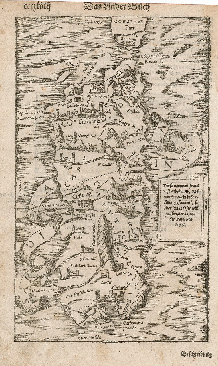 Carta geografica della Sardegna con titolo "Sardinia Insula" iscritto in un decorativo festone che sembra avvolgere l'isola. Nella raffigurazione cartografica spicca la delineazione del confine che suddivide l'isola in Caput Lugu Dori da Caput Calaris. Sulla destra entro semplice riquadro vengono fornite indicazioni riguardanti la toponomastica utilizzata