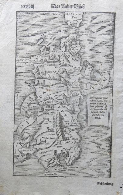 Basilea, 1550 circa. Xilografia, b/n, cm 20 x 30 (il foglio). Dalla “Cosmographiae Universalis” (lib. VI – Basileae, Henrichum Petri, 1550). Edizione tedesca con riquadro figurato (la città di Napoli vittima di catastrofe) al verso del foglio. Si vede la punta meridionale della Corsica con segnalata Bonifacio. Il disegno dell'isola, il cui titolo è inserito in un nastro svolazzante che la abbraccia, mostra una semiologia elementare; i rilievi sono rappresentati da vedute prospettiche di mucchi di talpa allineati a catena; i fiumi da un tratto forte; il mare da un tratteggio ondulato con strisce bianche e nere alternate; la vegetazione è simboleggiata da gruppi di alberelli, mentre i centri abitati sono segnalati da prospettini di case e torri. Sebastian Munster (1488 – 1552). Foglio con alcune gualciture, discreto stato di conservazione.