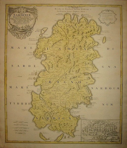 Carta geografica originale (cm. 48x57,5 più ampi margini bianchi). Coloritura coeva all’acquarello. Carta filigranata. Ottimo esemplare. Nel riquadro in basso a destra è presente una pianta prospettica della città di Cagliari.