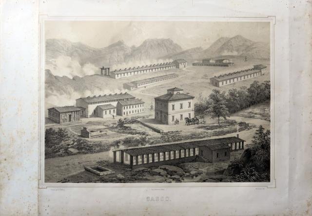 Lemercier, Parigi, 1851. Dall’opera “Album des diverses localitée formant les etablissements industriales d’acide boracique fondé en Toscane”, tonolitografia (nero /seppia), cm 28, 5 x 41,3 (la parte figurata), cm 42 x 59, 2 (il foglio). Disegnata da E. Chelli, litografata da Eugenio Ciceri e impressa da Lemercier, la veduta raffigura Sasso con gli insediamenti industriali, animata da persone e animali. La presenza di acque bollenti e putride nella zona era nota fin dall’antichità. L’attività di sfruttamento dei vapori caldi, per ricavare acido borico, iniziò nel 1827, grazie all’ingegnere e imprenditore francese François Jaques de Larderel (Vienna, 5 agosto 1790 – Firenze, 15 giugno 1858), il quale promosse lo sfruttamento industriale dei soffioni boraciferi nella frazione del comune di Pomarance, attualmente nota come Larderello, appunto dal nome dello stesso Larderel. Le vedute si riferiscono quindi all’impianto dei primi stabilimenti, intorno al 1830. Successivamente fu il principe Ginori a comprendere le potenzialità del luogo per produrre energia (ingabbiando il vapore sotto delle cupole si poteva ottenere energia elettrica) e a incentivarne lo sfruttamento. Leggerissimo foxing ai margini bianchi e due pieghe lungo i margini laterali. Peraltro bella la veduta in buono stato.
