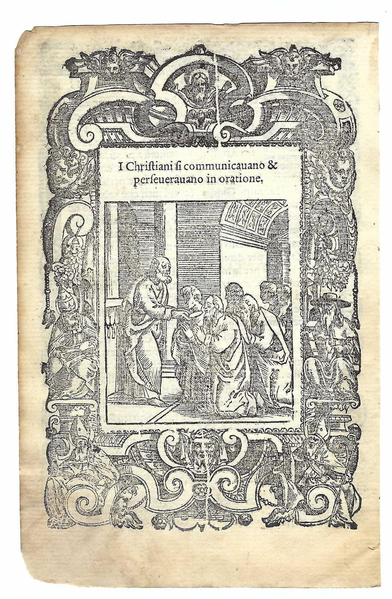Xilografia cm. 15,7 x 10,5 il foglio, cm 13,7 x 9,4 parte incisa, bruniture ai margini, lievi mancanze al margine inferiore sinistro, margine inferiore esterno brunito e assottigliato