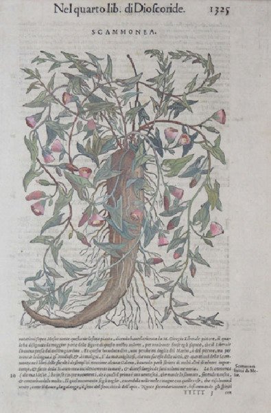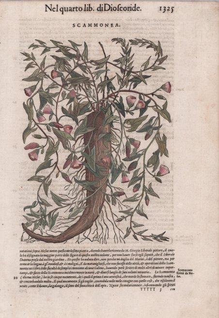 Opera tratta da I discorsi di M. Pietro Andrea Matthioli sanese, medico cesareo, et del serenissimo prencipe Ferdinando arcidvca d'Austria & c. Ne i sei Libri di Pedacio Dioscoride Anazarbeo della materia medicinale. ' Con dedica alla Principessa Giovanna, arciduchessa d’Austria (il Mattioli era medico reale), escono in volgare, nel 1568, i sei libri di nuovo dallo istesso autore ricorretti, & in più di mille luoghi aumentati. Con le figure grandi tutte di nuovo rifatte, & tirate dalle naturali & vive piante & animali, & in numero maggiore che le altre per avanti stampate. ' Lo stesso Pietro Andrea Mattioli presenta così la nuova edizione del libro, che già ha ricevuto molti consensi e che toccherà il culmine del successo grazie, appunto, alla forma di presentazione molto più organica, alla completezza delle informazioni, e, soprattutto, alla ricchezza e alla chiarezza delle illustrazioni. Chi sapesse tutte le virtù delle piante farebbe miracoli: questo enunciato dell’autore sembra animare per primo proprio lui, che va a cercare con certosina pazienza ogni minimo appiglio per lodare le virtù medicinali di ogni erba, raccontando ogni aneddoto, scoprendo ogni notizia curiosa, riportando ogni considerazione fatta sull’argomento da altri studiosi prima di lui. ' Il tono enciclopedico dell’opera si avverte, in maniera evidente, fin dalla dedica. Il discorrere dell’autore, le cui radici toscane o, per meglio dire, senesi non si smentiscono, è agile, piano, adatto ad un pubblico ampio, anche meno colto e poco preparato ma che, in qualche maniera, faceva parte del vasto mondo della medicina e della farmacia del tempo. Non è un caso che il testo sia tra quelli rimasti più a lungo in uso, anche nel piccolo bagaglio librario di famiglie povere o quasi analfabete. ' Alla sostanziosa dedica segue un proemio dedicato agli addetti ai lavori e le solite lettere di complimenti. Seguono due copiose tavole, cioè due indici: uno analitico per tutte le voci, l’altro per patologie. ' L’opera vera e propria inizia con il ritratto a piena pagina di Mattioli e illustra, in sequenza, le piante medicinali (concentrate nei primi quattro libri) e una serie di preparazioni (oli, unguenti, ecc.). Per Mattioli l’occasione è ghiotta sia per potersi dilungare sulla esatta identificazione delle specie, mostrando una vasta preparazione botanica, sia, soprattutto, per mostrare le splendide immagini delle piante, che, a volte, sono anche più di una per esemplare e messe a confronto, qualora il lettore avesse dubbi. Il secondo libro è dedicato in parte agli animali marini (ricci, spugne, seppie, pesci, ecc.) in parte a quelli terrestri (lepri, capriolo, castoreo, rospo, ecc.), comprese le vipere e le api con relativi prodotti (miele, cera, propoli, ecc.). Il quinto libro è dedicato ai minerali e il sesto ai veleni. ' Di ogni voce viene riportato il testo di Dioscoride tradotto in italiano, un esame moderno di identificazione con analogie e confronto dei pareri di autori diversi poi le virtù e i nomi in più lingue. ' Un’opera che ha lasciato il segno nella letteratura medica e farmaceutica del Rinascimento e che, ancora oggi, sprizza fascino ad ogni pagina. Plate taken from I discorsi di M. Pietro Andrea Matthioli sanese, medico cesareo, et del serenissimo prencipe Ferdinando arcidvca d'Austria & c. Ne i sei Libri di Pedacio Dioscoride Anazarbeo della materia medicinale printed in Venice by Vincenzo Valgrisi. Mattioli's Italian translation of the works of Dioscorides. ' Mattioli (1501-1577) was a Siennese doctor and naturalist. He described more than one hundred new plants and contributed to the development of medical botany. This, his most important work, was first printed in 1544 in Italian, 1554 in Latin, French in 1561, Czech in 1562, and in German in 1563. ' The wood cuts in his work were accurate and standardized enough to allow for easy identification. While nominally a commentary on the work of the botanist Dioscordies, Mattioli significantly expanded the work by adding major new contributions. He relied in part on the contributions of the Turkish diplomat, Buscecq, his doctor, Quakelbeen, and the famed botanist, Luca Ghini, who founded the botanical garden in Pisa. ' In this work, Mattioli significantly provided the first known observation of a tomato being grown and eaten in Italy. Woodcut with fine later hand colour, good condition. Cfr.