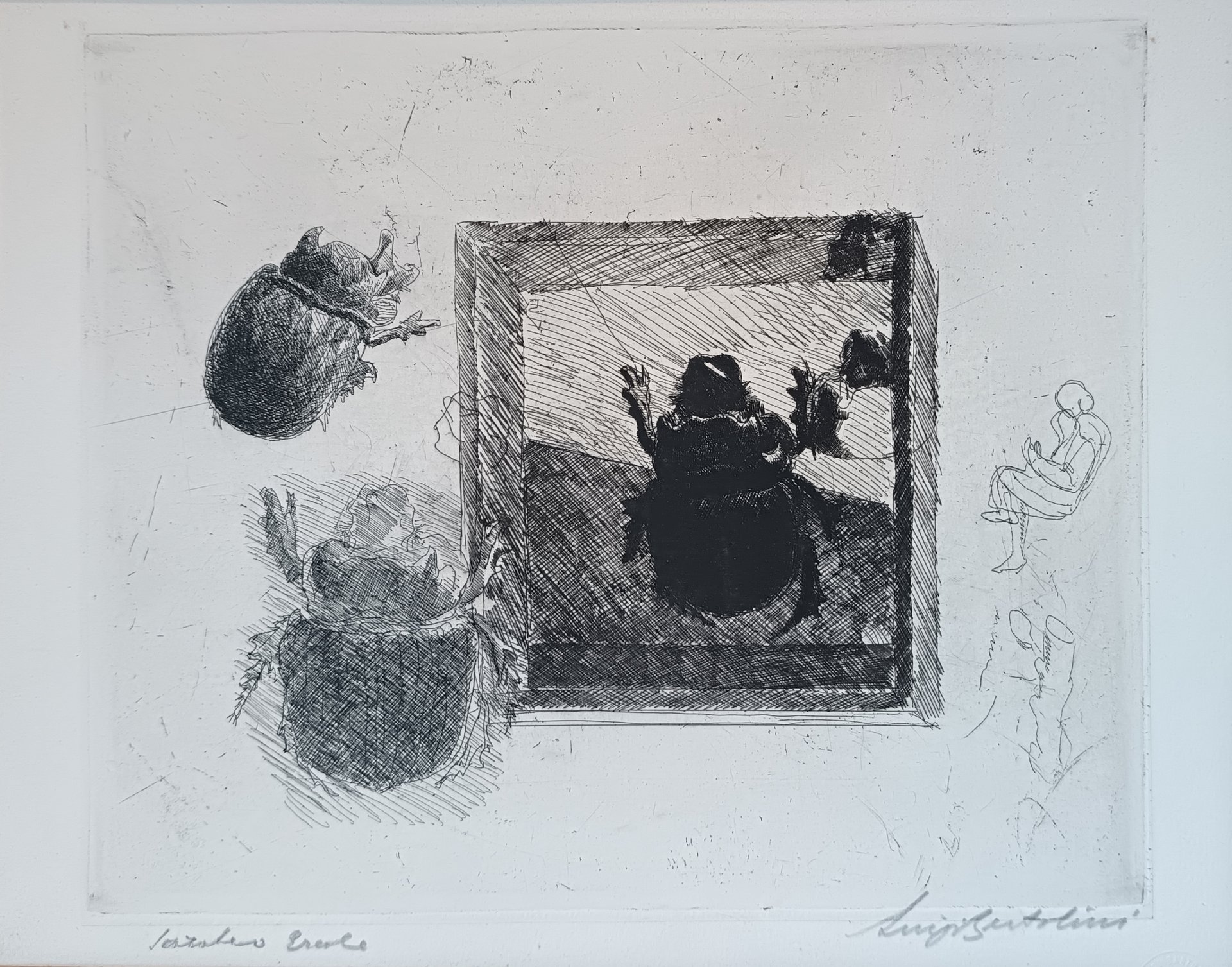 L'incisione ha una lunga storie espositiva a partire dalla Quadriennale di Roma del 1935, poi premiata a Lugano nel 1953 alla Mostra del Bianco e Nero. A matita nel margine inferiore, a sinistra: Scarabeo Ercole, a destra Luigi Bartolini. Timbro a secco Luigi Bartolini Incisore all'Acquaforte.
