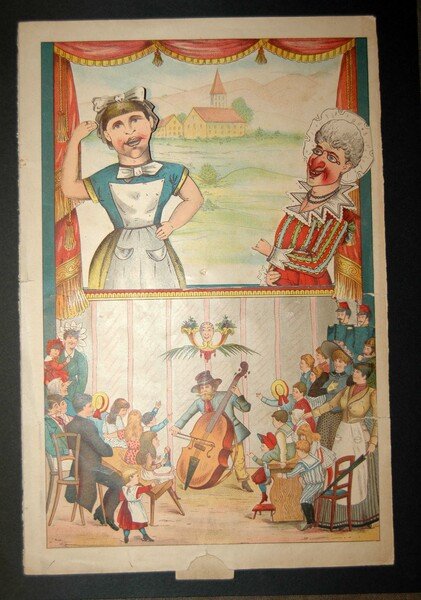 Cromolitografia di gisto popolare. cm. 36,5x24. Una lingietta al marg. inferiore permette il movimento delle due figure femminili protagoniste della scena teatrale. Al marg. inf. musicista e spettatori assistono divertiti. Curiosa. Folc