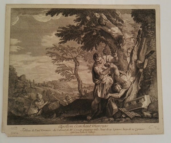 Bella incisione mitologica. Buono stato di conservazione. Apollon écorchant Marsyas. Tableau de Paul Veronèse, du Cabinet de Mr Crozat, peint sur toile, haut de 19 1/2 pouces, large de 25 0/4 pouces. Gravé par François Joullain. Dimensioni: 37 cm x 30.