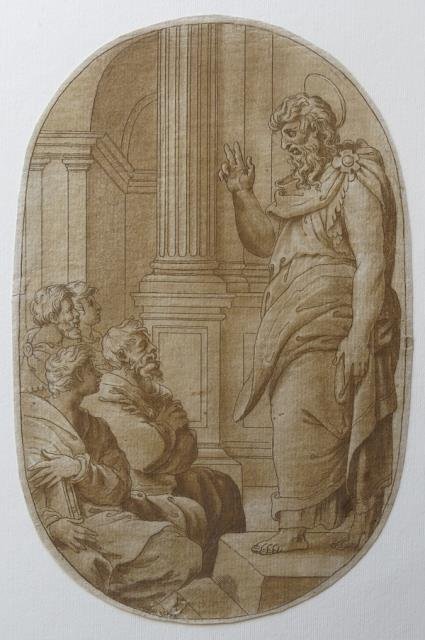 Tratta dall'opera "Disegni originali d’Eccellenti Pittori esistenti nella Real Galleria di Firenze incisi ed imitati nella loro grandezza e colori. All’Altezza Reale di Pietro Leopoldo Principe Reale d’Ungheria e di Boemia Arciduca d’Austria, Granduca di Toscana &c &c &c. Protettore Magnanimo e Glorioso delle Belle Arti. Stefano Mulinari Incisore Fiorentino. In Atto di Umilissimo Ossequio dedica e consacra". Stefano Mulinari, Firenze, 1774 – 1782. Da autore non riportato, incisione in rame all'acquatinta, cm 16 x 24 (il foglio). Un irrilevante difetto del foglio al margine tondo inferiore, stretti margini oltre la filettatura dell'inciso, buono lo stato di conservazione. .