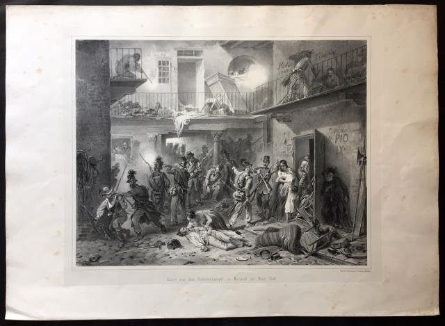 Da “Erinnerungen an die Feldzuge. der K. K. Oester. Armee in italien in den Janren 1848 – 1849” (Adam in Munchen, 1851). Litografia, b/n, cm 44 x 61 (il foglio). Animata scena di un momento di subbuglio cittadino durante i moti della prima guerra d’Indipendenza. Alcune leggere fioriture ai margini ma buona impressione e buono stato. .