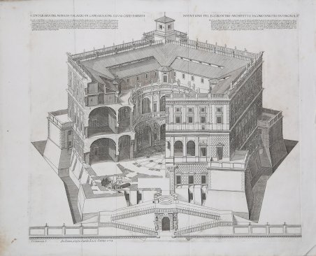 Bulino, 1617, impresso su carta vergata coeva, con filigrana, ' ' in ottimo stato di conservazione. Ristampa di Carlo Losi, con data 1773. Lungo il margine superiore: SCENOGRAFIA DEL NOBILISS PALAZZO DI CAPRAROLA DEL ILLVS CARD FARNESE INVENTIONE DEL ECCELENTISS ARCHITETTO ACOMO BAROTO DA VINGNOLA In alto a sinistra: ' Questo nobiliss.o (o as superscript) Palazzo è talmente accominodato che no vi sta alcuna particella otiosa et quel che è mirabile, le stanze de patroni sono / talmente poste che non veggorio officina nessuna ne essercitio forido. Il che ha fatto amirarllo da chiunche l'ha veduto, per il piu / compitamente ornato, et comodo palazzo del mondo; et ha con disiderio tirato à vedere la miraniglie sue da lontane parti huomini molto / guiditosi, come fu per semepio Monsignor Daniel Barbaro, persona molto squesita nelle cose dell'Architetura; il qual' mosso dalla gran fana di / questo palazzo, per no se n andar preso alle grida vene à posta a vederllo; et havendolo considerato à parte et inteso minutamente al istesso / Vignola l'ordine di tutti membri di si compita macina disse queste parole. Non minuit immo magnopere vicit presentia famam. Eg giudico in / quel sito non poterse far cosa piu compita. In alto a destra: ' Il terzzo ordine di questo Palazzo segnato in questo disegno al profile A ancorche tutto questo piano overo [.] / dissimile à questo luogo il quale ha nel mezzo a coritore B che volte intorno per servitio di 60 carnere essendo [.] / con 40 mezzane sopra el D per l'altra fila delle 23 altre carnere con otto porte comune che escono sopra la loggia circolare [.] / grosezza del muro per cicever et condurre l'aque fuori del palazzo. F. corritore largo di 10 palini portato sopra [.] / del muro il qual coperto per non esser fatta la balaustrata G. Canne di tutti li camini del palazzo. H Torre del palazzo minore / che l'disegno dell'Architetto, Altezza principale di questo palazzo palmi 120 per l'altezza di tutto il palazzo cioe de l'piano del / cortile a K. sopora l'ultima cornice palmi 80 per l'altezza de doi ordini del cortile In basso a sinistra: ' F. Villamaerna F. Romae Anno 1617 cum Privilegio Summi Pont, et superior licentia ' Della serie: “Alcune opera d’archiettetura di Jacomo Barotio da Vignola Raccolte e poste in luce da Francesco Villamena l’anno MDCXVII” Engraving, 1617; printed on contemporary laid watermarked paper, in very good condition. A second state with Carlo Losi imprint and date 1773. At top: SCENOGRAFIA DEL NOBILISS PALAZZO DI CAPRAROLA DEL ILLVS CARD FARNESE INVENTIONE DEL ECCELENTISS ARCHITETTO ACOMO BAROTO DA VINGNOLA At upper left: ' Questo nobiliss.o (o as superscript) Palazzo è talmente accominodato che no vi sta alcuna particella otiosa et quel che è mirabile, le stanze de patroni sono / talmente poste che non veggorio officina nessuna ne essercitio forido. Il che ha fatto amirarllo da chiunche l'ha veduto, per il piu / compitamente ornato, et comodo palazzo del mondo; et ha con disiderio tirato à vedere la miraniglie sue da lontane parti huomini molto / guiditosi, come fu per semepio Monsignor Daniel Barbaro, persona molto squesita nelle cose dell'Architetura; il qual' mosso dalla gran fana di / questo palazzo, per no se n andar preso alle grida vene à posta a vederllo; et havendolo considerato à parte et inteso minutamente al istesso / Vignola l'ordine di tutti membri di si compita macina disse queste parole. Non minuit immo magnopere vicit presentia famam. Eg giudico in / quel sito non poterse far cosa piu compita. At upper right: ' Il terzzo ordine di questo Palazzo segnato in questo disegno al profile A ancorche tutto questo piano overo [.] / dissimile à questo luogo il quale ha nel mezzo a coritore B che volte intorno per servitio di 60 carnere essendo [.] / con 40 mezzane sopra el D per l'altra fila delle 23 altre carnere con otto porte comune che escono sopra la loggia circolare [.] / grosezza del muro per cicever et condurre l'aque fuori del palazzo. F. corritore largo di 10 palini portato sopra [.] / del muro il qual coperto per non esser fatta la balaustrata G. Canne di tutti li camini del palazzo. H Torre del palazzo minore / che l'disegno dell'Architetto, Altezza principale di questo palazzo palmi 120 per l'altezza di tutto il palazzo cioe de l'piano del / cortile a K. sopora l'ultima cornice palmi 80 per l'altezza de doi ordini del cortile At lower left: ' F. Villamaerna F. Romae Anno 1617 cum Privilegio Summi Pont, et superior licentia ' From the series: “Alcune opera d’archiettetura di Jacomo Barotio da Vignola Raccolte e poste in luce da Francesco Villamena l’anno MDCXVII” Cfr.