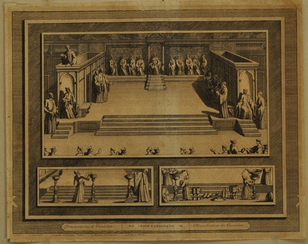 Acquaforte e bulino di mm 350 x 256. Vergatina olandese. Filigrana non rilevata. Foglio discreto con restauri per fori di tarlo, margini ridotti, carta arrossata. Fa parte di: Thesaurus antiquitatum et historiarum Italiae, vol. IX Georgius Graevius "Thesaurus antiquitatum et historiarum Italiane", Leida 1704 - 1723.
