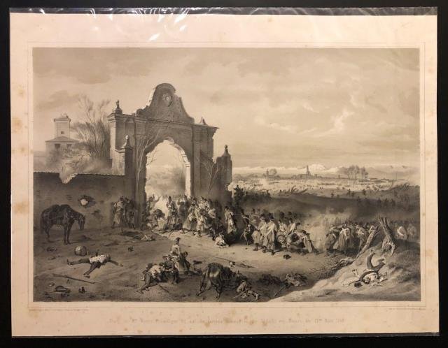 Da “Erinnerungen an die Feldzuge. der K. K. Oester. Armee in italien in den Janren 1848 – 1849” (Adam in Munchen, 1851). Litografia in b/n, cm 34 x 45 (il foglio). Animata scena di battaglia con le truppe austriache in aperta campagna durante la prima guerra d’Indipendenza. Leggermente rifilata ai margini e un minimo foxing marginale ma molto buono lo stato di conservazione.