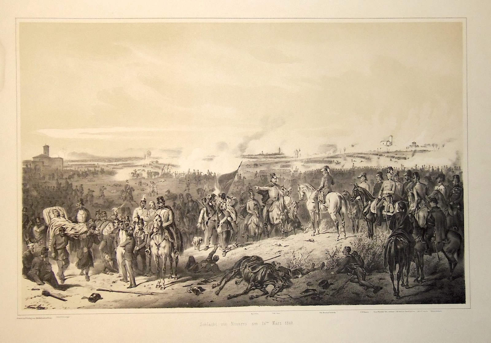 Litografia, 332x517. Animata scena di battaglia con le truppe austriache rappresentate fuori Novara. Tratta da "Erinnerung and die italienische Feldzuege der K.K. osterreich. Armee, 1848-49". Bell'esemplare con qualche fioritura lieve ai margini.